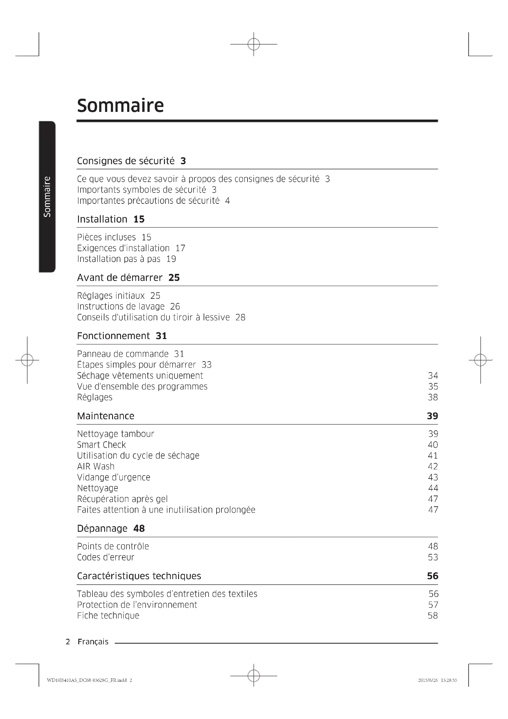 - Save water and electricity by only washing full loads (the exact amount depends upon the program used). WD10J6410AS_DC68-03628G_EN.indd 57 2015/6/26 15:19:5358 English Specications Specications Specication sheet “ * ” Asterisk(s) means variant model and can be varied (0-9) or (A-Z). Type Front loading washing machine Model name WD10J6***** Dimensions W600 x D650 x H850 (mm) Water pressure 50 kPa ~ 800 kPa NET weight 70 kg Wash and spin capacity 10.2 kg Dry Capacity 6.0 kg Power consumption Washing 220 V 100 W 240 V 100 W Washing and heating 220 V 2000 W 240 V 2400 W Drying 220 V 1600 W 240 V 1600 W Spin 220 ~ 240 V 450 W Pumping 30 W Spin revolutions 1400 rpm NOTE The design and specications are subject to change without notice for quality improvement purposes. WD10J6410AS_DC68-03628G_EN.indd 58 2015/6/26 15:19:53Memo WD10J6410AS_DC68-03628G_EN.indd 59 2015/6/26 15:19:53DC68-03628G-00 QUESTIONS OR COMMENTS? COUNTRY CALL OR VISIT US ONLINE AT ALGERIA 021 36 11 00 www.samsung.com/n_africa/support WD10J6410AS_DC68-03628G_EN.indd 60 2015/6/26 15:19:54Lave-linge Manuel d'utilisation WD10J6***** SSEC SEC WD10J6410AS_DC68-03628G_FR.indd 1 2015/6/26 15:28:552 Français Sommaire Sommaire Consignes de sécurité 3 Ce que vous devez savoir à propos des consignes de sécurité 3 Importants symboles de sécurité 3 Importantes précautions de sécurité 4 Installation 15 Pièces incluses 15 Exigences d'installation 17 Installation pas à pas 19 Avant de démarrer 25 Réglages initiaux 25 Instructions de lavage 26 Conseils d'utilisation du tiroir à lessive 28 Fonctionnement 31 Panneau de commande 31 Étapes simples pour démarrer 33 Séchage vêtements uniquement 34 Vue d'ensemble des programmes 35 Réglages 38 Maintenance 39 Nettoyage tambour 39 Smart Check 40 Utilisation du cycle de séchage 41 AIR Wash 42 Vidange d’urgence 43 Nettoyage 44 Récupération après gel 47 Faites attention à une inutilisation prolongée 47 Dépannage 48 Points de contrôle 48 Codes d’erreur 53 Caractéristiques techniques 56 Tableau des symboles d’entretien des textiles 56 Protection de l’environnement 57 Fiche technique 58 WD10J6410AS_DC68-03628G_FR.indd 2 2015/6/26 15:28:55Français 3 Consignes de sécurité Consignes de sécurité Félicitations pour l’achat de votre nouveau lave-linge Samsung. Ce manuel contient des informations importantes sur l’installation, l’utilisation et l’entretien de votre appareil. Prenez le temps de lire ce manuel an de pouvoir proter pleinement des nombreux avantages et fonctions de votre lave-linge. Ce que vous devez savoir à propos des consignes de sécurité Veuillez lire attentivement ce manuel pour vous assurer que vous savez comment utiliser efcacement toutes les caractéristiques et fonctions de votre nouvel appareil en toute sécurité. Conservez-le dans un endroit sûr à proximité de l’appareil pour vous y référer ultérieurement. Utilisez uniquement cet appareil pour son usage prévu, tel que décrit dans ce manuel d’utilisation. Les avertissements et les consignes de sécurité importantes cités dans ce manuel ne couvrent pas toutes les conditions et les situations susceptibles de se produire. Il est de votre responsabilité de faire preuve de bon sens, de prudence et de discernement lors de l’installation, de l’entretien et de l’utilisation de votre lave-linge. Parce que les consignes d’utilisation suivantes concernent plusieurs modèles, les caractéristiques de votre lave-linge sont peut-être légèrement différentes de celles décrites dans ce manuel et l’ensemble des symboles d’avertissement peuvent ne pas s’appliquer à vous. Pour toute question ou renseignement, contactez le service après-vente le plus proche ou recherchez des informations et consultez l’aide en ligne sur www.samsung.com. Importants symboles de sécurité Signication des icônes et des symboles utilisés dans ce manuel: AVERTISSEMENT Risques ou pratiques dangereuses susceptibles de provoquer des blessures corporelles graves, le décès et/ou des dommages matériels. ATTENTION Risques ou pratiques dangereuses susceptibles de provoquer des blessures corporelles graves et/ou des dommages matériels. NOTE Indique qu'un risque de blessure à la personne ou de dommage matériel existe. WD10J6410AS_DC68-03628G_FR.indd 3 2015/6/26 15:28:564 Français Consignes de sécurité Consignes de sécurité Ces symboles d’avertissement sont présents pour prévenir toute blessure, à vous-même ou à d’autres personnes. Veuillez les respecter scrupuleusement. Après avoir lu ce manuel, conservez-la dans un endroit sûr pour vous y référer ultérieurement. Lisez l’ensemble des consignes avant d’utiliser l’appareil. Comme pour tout appareil électrique comportant des parties mobiles, des risques existent. Pour utiliser cet appareil en toute sécurité, familiarisez-vous avec son fonctionnement et faites preuve de prudence lorsque vous l’utilisez. Importantes précautions de sécurité AVERTISSEMENT Pour réduire le risque d'incendie, de choc électrique, ou de blessure à la personne lors de l'utilisation de votre appareil, veuillez suivre les précautions de base, y compris ce qui suit : Ne laissez pas les enfants (ou les animaux) jouer sur ou à l’intérieur de votre lave-linge. La porte du lave-linge ne s’ouvre pas facilement de l’intérieur, et il existe un risque de blessure grave si un enfant est enfermé à l’intérieur. Cet appareil n’est pas prévu pour être utilisé par des personnes (y compris les enfants) dont les capacités physiques, sensorielles ou mentales sont réduites ou des personnes dénuées d’expérience ou de connaissance, sauf si elles ont pu bénécier, par l’intermédiaire d’une personne responsable de leur sécurité, d’une surveillance ou d’instructions préalables concernant l’utilisation de l’appareil. Les enfants doivent être surveillés an qu’ils ne jouent pas avec l’appareil. Pour une utilisatio