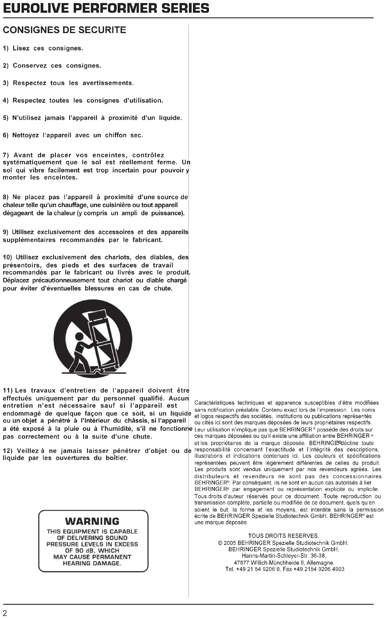 ATTENTION ! + Les enceintes de la série EUROLIVE PERFORMER peuvent développer un volume sonore extrême. Noubliez pas que de fortes pressions acoustiques fatiguent louïe et peuvent même lendommager de façon irrémédiable. Travaillez toujours à des puissances raisonnables.