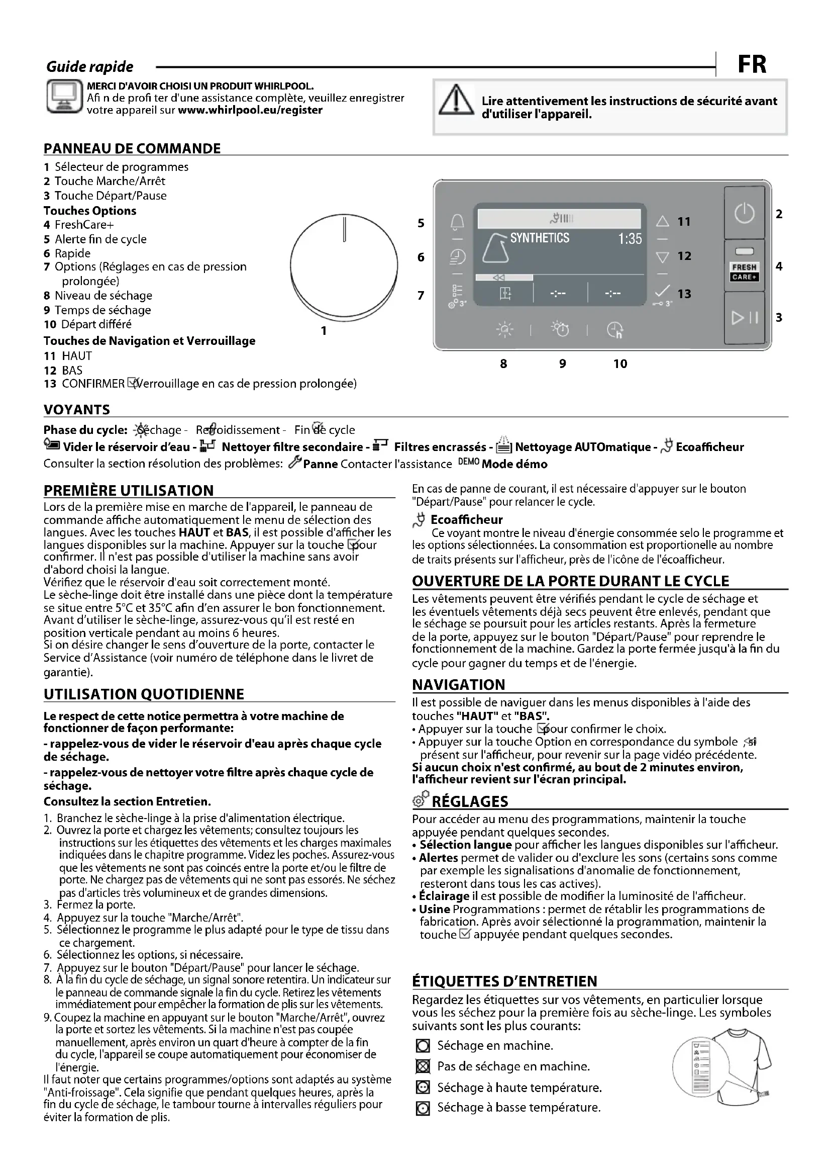 1 Sélecteur de programmes 2 Touche Marche/Arrêt 3 Touche Départ/Pause Touches Options 4 FreshCare+5 Alerte fin de cycle6 Rapide7 Options (Réglages en cas de pression prolongée) 8 Niveau de séchage9 Temps de séchage10 Départ différé Touches de Navigation et Verrouillage 11 HAUT12 BAS13 CONFIRMER (Verrouillage en cas de pression prolongée)