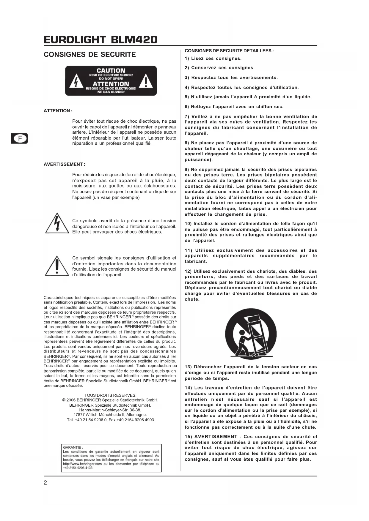 Pour réduire les risques de feu et de choc électrique, n’exposez pas cet appareil à la pluie, à la moisissure, aux gouttes ou aux éclaboussures. Ne posez pas de récipient contenant un liquide sur l’appareil (un vase par exemple). Ce symbole avertit de la présence d’une tension dangereuse et non isolée à l’intérieur de l’appareil. Elle peut provoquer des chocs électriques. Ce symbol signale les consignes d’utilisation et d’entretien importantes dans la documentation fournie. Lisez les consignes de sécurité du manuel d’utilisation de l’appareil.3 EUROLIGHT BLM420