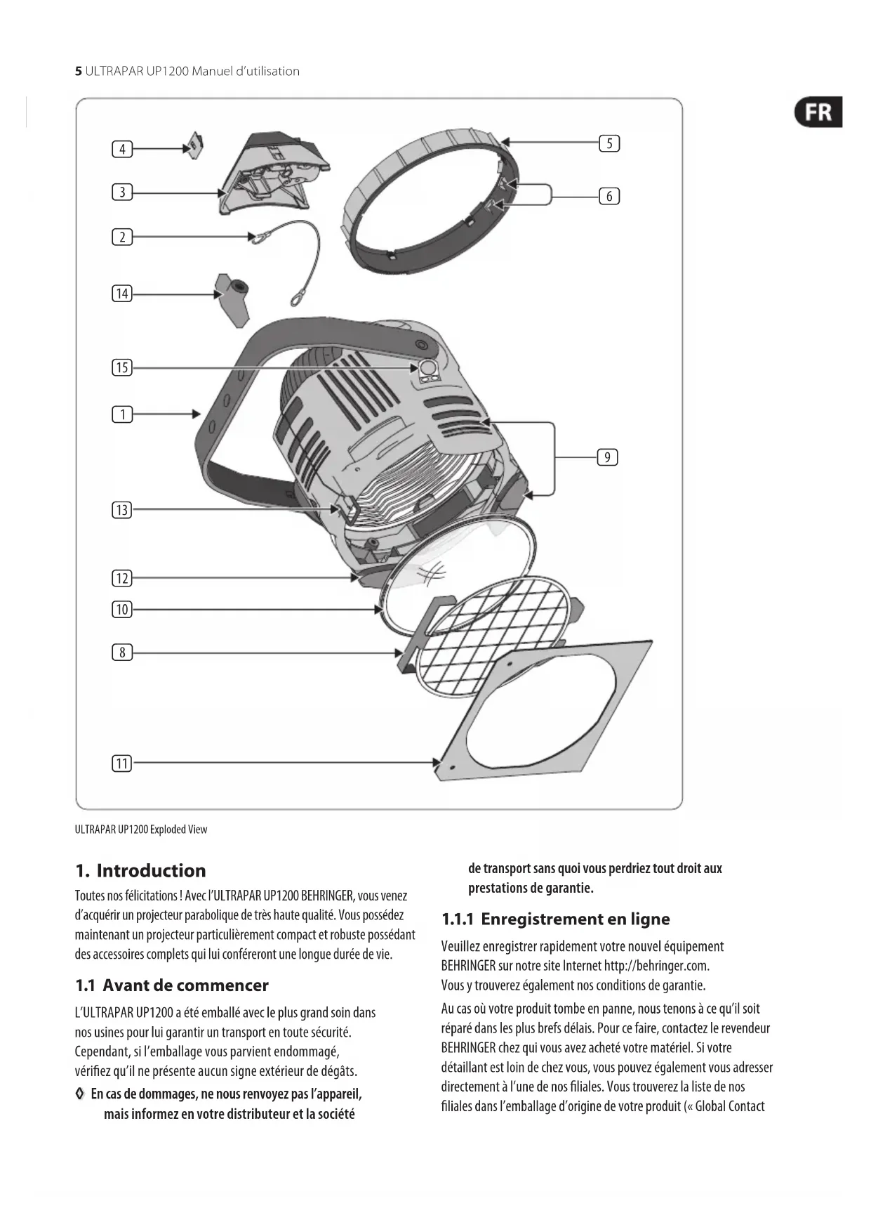 Toutes nos félicitations ! Avec l’ULTRAPAR UP1200 BEHRINGER, vous venez d’acquérir un projecteur parabolique de très haute qualité. Vous possédez maintenant un projecteur particulièrement compact et robuste possédant des accessoires complets qui lui conféreront une longue durée de vie.