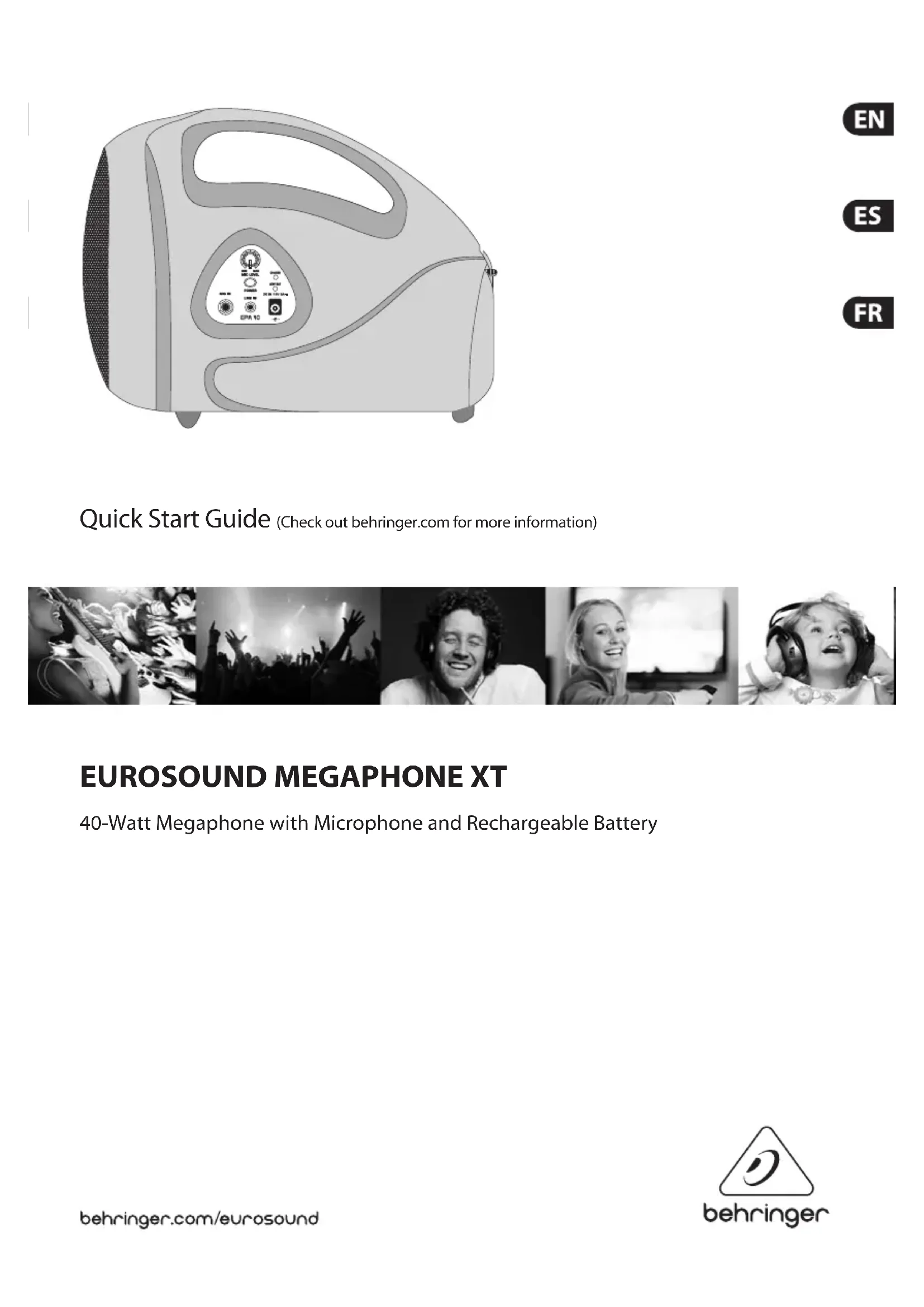 DÉDIT LÉGAL12 13Quick Start GuideEUROSOUND MEGAPHONE XT § 6 Réclamations Sous la seule réserve du fonctionnement des lois locales applicables, MUSICGroup n'assume aucune responsabilité envers l'acheteur au regard de cette Garantie Limitée en ce qui concerne les pertes consécutives ou indirectes ou les dommages d'aucune sorte. En aucun cas la responsabilité de MUSIC Group dans le cadre de cette garantie, ne pourra excéder la valeur facturée du produit. § 7 Limites de Responsabilité Cette Garantie Limitée constitue la garantie complète et exclusive existant entre vous et MUSIC Group. Elle annule et remplace toute autre communication écrite ou orale relative à ce produit. MUSIC Group n'o re aucune autre garantie pour ce produit. § 8 Autres droits de garantie et droit national (1) En aucune façon, cette Garantie Limitée ne peut exclure ou limiter les droits statuaires de l'acheteur en tant que consommateur. (2) Les règles de la Garantie Limitée mentionnées dans ce document sont applicables, sauf si elles sont en violation des lois locales. (3) Cette Garantie Limitée ne modi e pas les obligations légales du vendeur en ce qui concerne les défauts de conformité et vices cachés du produit. § 9 Amendement Les conditions de cette garantie sont sujettes à changement sans préavis. Nousvous prions de vous référer régulièrement aux derniers termes, conditions et informations complémentaires concernant la Garantie Limitée de MUSIC Group, en allant sur www.music-group.com ou ses liales. Assistance Clientèle Enregistrez-vous sur Internet. Prenez le temps d’enregistrer votre nouvel équipement MUSIC Group dès son achat sur le site www.music-group.com. Preuve d’achat. Nous vous demandons de conserver votre preuve d’achat. Cettepreuve valide et marque le début de votre garantie limitée à la date indiquée sur la facture. Si vous perdez cette preuve d’achat, votre garantie s’annule. En cas de panne du produit. Dans le cas improbable d’une panne de votre produit, ou –de son fonctionnement médiocre, renvoyez-le au revendeur qui vous l’a vendu. Veillez à joindre une copie de la facture d’achat initiale pour tout échange ou remboursement. Questions? Si vous avez d’autres questions, contactez votre revendeur local MUSIC Group (BEHRINGER). Pourcontacter directement MUSIC Group, consultez les informations de contact fournies dans le carton. For your records / Datos necesarios para posibles consultas / Pour votre information: Serial number: Número de serie: Numéro de série : Purchase date: Fecha de compra: Date d’achat : Dealer name: Nombre del establecimiento: Nom du revendeur : Dealer phone: Teléfono del establecimiento: Numéro de téléphone : Please keep your purchase receipt with this Quick Start Guide. Conserve la factura de compra junto con este Manual de puesta en marcha. Conservez la facture d’achat avec ce guide de prise en main.(EN) Step: Controls (ES) Paso: Controles EUROSOUND MEGAPHONE XT Controls (8)(1) (3) (2) (3) (5)(4) (9) (7) (6)(10) (11) (1) LOUDSPEAKER. (2) CARRY HANDLE. (3) HOLES FOR SHOULDER STRAP. (4) The rotary MIC LEVEL control allows you to adjust the volume level. (5) The POWER switch turns the device on and o . When turned on, the LED of the POWER switch lights up. (6) The CHARGE LED ashes yellow as long as the rechargeable battery is charging. It goes out when the battery is fully charged. (7) The LOW BAT LED indicates that the rechargeable battery needs to becharged. (8) Connect the supplied BEHRINGER XM1800S microphone to the MICINinput. ◊ Never hold the microphone directly in front of the loudspeaker. Feedback hazard! When operating the device, keep the microphone behind the loudspeaker to avoid feedback. (9) You can connect an external sound source (CD player, MP3 player, etc.) tothe LINE IN input. (10) Connect to the power supply via the polarized DC IN connector. Atting power adapter is supplied. Usethe device only with the included powersupply.