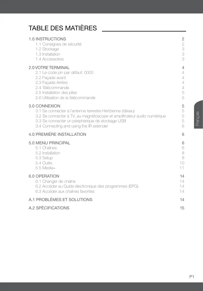 A.1 Problèmes et solutions Il peut y avoir différentes raisons au dysfonctionnement du terminal. Si vous rencontrez des problèmes avec ce récepteur ou son installation, veuillez tout d’abord lire attentivement les paragraphes appropriés de ce Manuel d’Utilisation et cette section “Problèmes & Solutions”. Si le terminal ne fonctionne pas après vérification contacter votre revendeur ou la Hotline. Ne pas ouvrir le capot du terminal, cela peut engendrer une situation à risque et entraînera la perte de la garantie. Problème Capteur IR ne s’allume pas Aucun signal trouvé Cause Prise secteur non branché ou positionnée sur OFF L’antenne est débranchée L’antenne est endommagée ou mal orientée Hors de portée du signal numérique L’antenne active doit être activée P14 OPERATION Solution Vérifier les branchements Vérifier le câble de l’antenne Vérifier l’antenne Vérifier la couverture du signal numérique auprès de votre revendeur Allumer l’antenne active Vous avez oublié le code de verrouillage des chaînes Aucune Image/ Aucun Son sur TV Message Chaîne cryptée Vous avez oublié le code de verrouillage des chaînes Vous avez oublié le code de verrouillage du Menu Plus de réception numérique après déplacement du récepteur dans une autre pièce. Le récepteur ce met en veille automatiquement. Cause Le terminal est éteint La télécommande n’est pas correctement dirigée Il y a un obstacle barrant le signal entre la télécommande et la TV Les piles sont trop faibles Solution Allumer le récepteur Diriger la télécommande vers le terminal Vérifier qu’il n’y a pas d’obstacle Changer les piles de la télécommande Réinstaller les chaînes pour annuler le verrou Péritel n’est pas sélectionnée sur votre TV TV ou VCR n’est pas brancher au secteur Chaîne à accès payant Sélectionner la bonne sortie TV La faible alimentation de l'antenne réduit le signal numérique reçu par le récepteur. Fonction mise en veille automatique activée. Vérifier l’alimentation Sélectionner une autre chaîne Réinstaller les chaînes pour annuler le verrou Contacter la hot line ou envoyer un email vers notre équipe support via www.thomsonstb.net Essayer une alimentation directe depuis l'antenne Français Problème Aucune réponse aux ordres de la télécommande Désactivé la fonction mise en veille automatique. Voir paragraphe