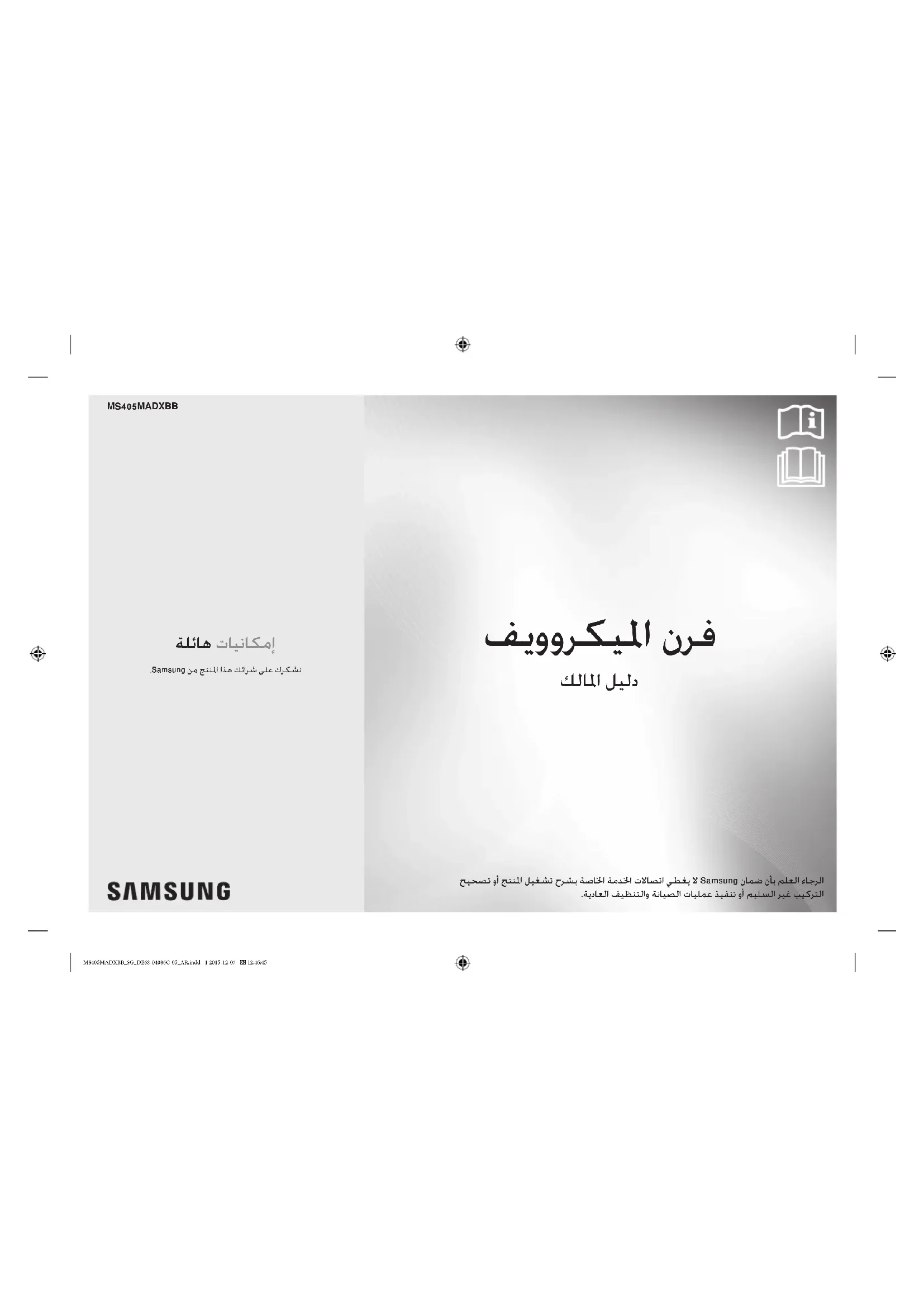 MS405MADXBB_SG_DE68-04086C-05_AR.indd 24 2015-12-07 12:46:57un monde de possibilités Nous vous remercions d’avoir choisi ce produit Samsung. Four micro-ondes Manuel d'utilisation MS405MADXBB Veuillez noter que la garantie Samsung n'inclut pas les déplacements du service après-vente pour expliquer le fonctionnement de l'appareil, corriger une installation non correcte ou exécuter des travaux de nettoyage ou d'entretien réguliers. MS405MADXBB_SG_DE68-04086C-05_FR.indd 1 2015-12-07 12:35:262 FRANÇAIS