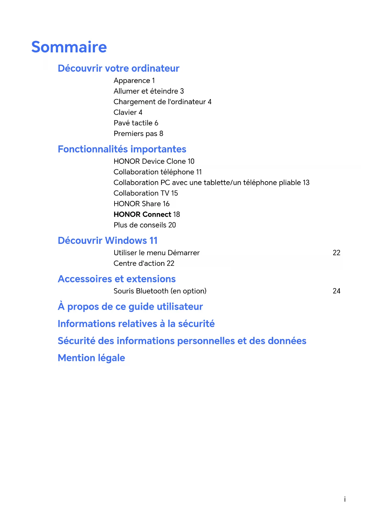 Guide d'utilisationSommaire Découvrir votre ordinateur Apparence 1 Allumer et éteindre 3 Chargement de l'ordinateur 4 Clavier 4 Pavé tactile 6 Premiers pas 8 Fonctionnalités impoantes HONOR Device Clone 10 Collaboration téléphone 11 Collaboration PC avec une tablette/un téléphone pliable 13 Collaboration TV 15 HONOR Share 16 HONOR Connect 18 Plus de conseils 20 Découvrir Windows 11 Utiliser le menu Démarrer