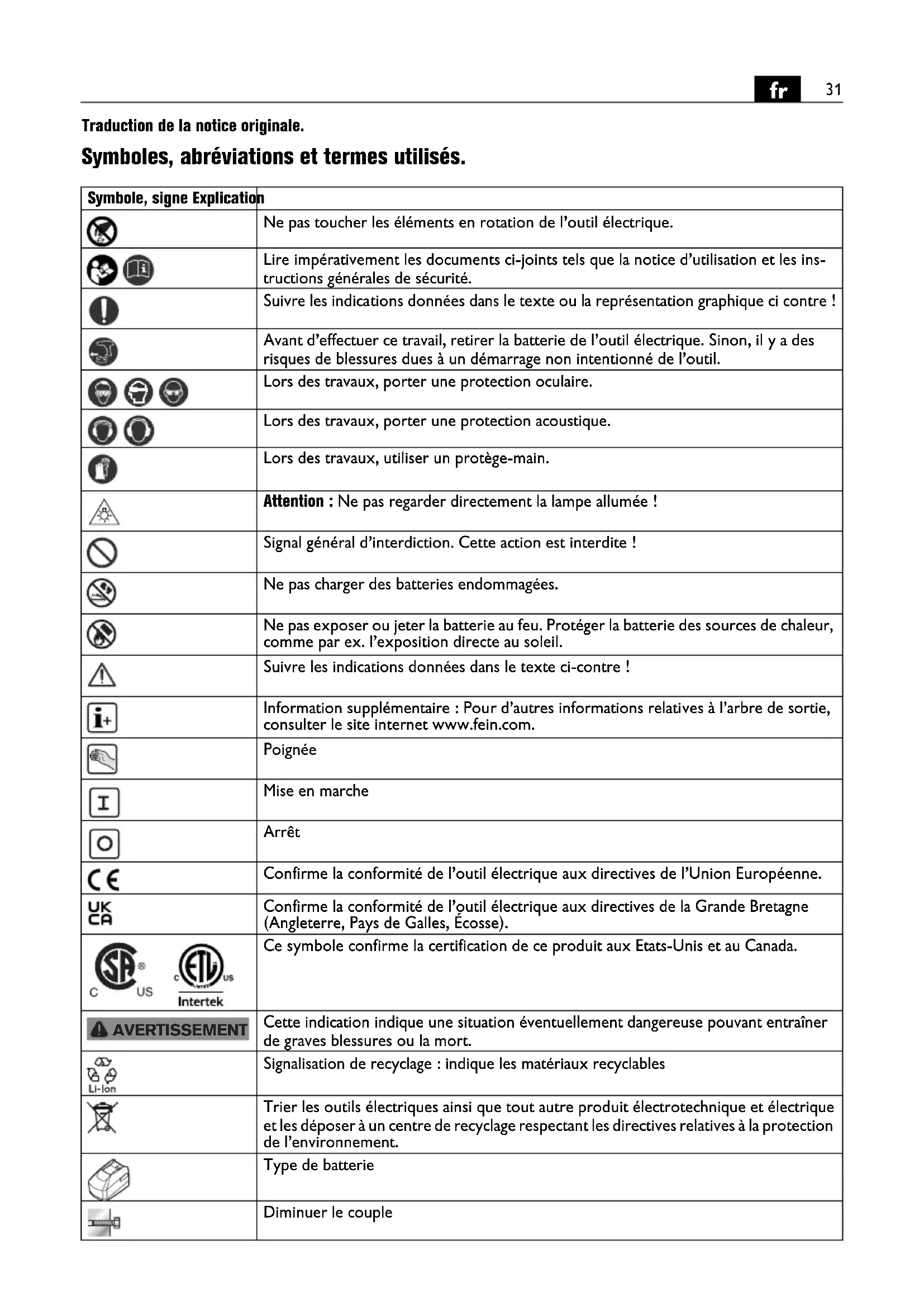 Traduction de la notice originale. Symboles, abréviations et termes utilisés. Symbole, signe Explication Ne pas toucher les éléments en rotation de l’outil électrique. Lire impérativement les documents ci-joints tels que la notice d’utilisation et les ins- tructions générales de sécurité. Suivre les indications données dans le texte ou la représentation graphique ci contre ! Avant d’effectuer ce travail, retirer la batterie de l’outil électrique. Sinon, il y a des risques de blessures dues à un démarrage non intentionné de l’outil. Lors des travaux, porter une protection oculaire. Lors des travaux, porter une protection acoustique. Lors des travaux, utiliser un protège-main. Attention : Ne pas regarder directement la lampe allumée ! Signal général d’interdiction. Cette action est interdite ! Ne pas charger des batteries endommagées. Ne pas exposer ou jeter la batterie au feu. Protéger la batterie des sources de chaleur, comme par ex. l’exposition directe au soleil. Suivre les indications données dans le texte ci-contre ! Information supplémentaire : Pour d’autres informations relatives à l’arbre de sortie, consulter le site internet www.fein.com. Poignée Mise en marche Arrêt Confirme la conformité de l’outil électrique aux directives de l’Union Européenne. Confirme la conformité de l’outil électrique aux directives de la Grande Bretagne (Angleterre, Pays de Galles, Écosse). Ce symbole confirme la certification de ce produit aux Etats-Unis et au Canada. Cette indication indique une situation éventuellement dangereuse pouvant entraîner de graves blessures ou la mort. Signalisation de recyclage : indique les matériaux recyclables Trier les outils électriques ainsi que tout autre produit électrotechnique et électrique et les déposer à un centre de recyclage respectant les directives relatives à la protection de l’environnement. Type de batterie Diminuer le couple AVERTISSEMENT32