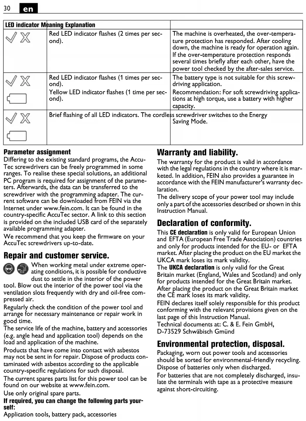 Paramétrage Les visseuses AccuTec peuvent être programmées librement dans certaines plages et diffèrent ainsi des programmes standard disponibles. Pour réaliser ces solutions spéciales, un logiciel supplémentaire pour le paramétrage est nécessaire. A l’aide de l’adaptateur de programmation, il est possible de transférer les don- nées ensuite à la visseuse. Le logiciel actuel peut être téléchargé sur le site Internet Fein www.fein.com. Il se trouve dans le sous-menu AccuTec dans la langue du pays respectif sélectionné. Vous trouverez un lien sur la carte USB de l’adaptateur de programmation disponible séparément. Nous recommandons de maintenir à jour le firmware de vos visseuses AccuTec. Travaux d’entretien et service après- vente. En cas de conditions d’utilisation extrêmes, lors du travail de matériaux métalliques, des poussières conductrices pourraient se dépo- ser à l’intérieur de l’outil électrique. Soufflez souvent de l’air comprimé sec et sans huile dans l’intérieur de l’outil électrique à travers les fentes de ventilation. Faites contrôler régulièrement l’état de l’outil électrique et faites effectuer à temps des travaux d’entretien et de réparation nécessaires. La durée de vie de la machine, de la batterie et des accessoires (par ex. renvoi d’angle et embouts et douilles de vissage) dépend de la charge et l’utilisation de la machine. Les produits ayant été en contact avec de l’amiante ne doivent pas être réparés. Éliminez les produits contami- nés par l’amiante conformément aux dispositions natio- nales relatives à l’élimination de déchets contenant de l’amiante. Vous trouverez la liste actuelle des pièces de rechange pour cet outil électrique sur notre site www.fein.com. N’utiliser que des pièces de rechange d’origine. Si nécessaire, vous pouvez remplacer vous-même les éléments suivants : Embouts et douilles, batterie, accessoires Garantie. La garantie du produit est valide conformément à la réglementation légale en vigueur dans le pays où le pro- duit est mis sur le marché. Outre les obligations de garantie légale, les appareils FEIN sont garantis confor- mément à notre déclaration de garantie de fabricant. Il se peut que seule u7ne partie des accessoires décrits ou représentés dans cette notice d’utilisation soit four- nie avec l’outil électrique. Déclaration de conformité La Déclaration CE est uniquement valable pour les pays de l’Union européenne et de l’AELE (Association Euro- péenne de Libre-Échange) et uniquement pour les pro- duits destinés au marché de l’UE ou de l’AELE. Une fois que le produit a été mis sur le marché de l’UE, la mar- que UKCA cesse d’être valable. La Déclaration UKCA est uniquement valable pour le marché britannique (Angleterre, Pays de Galles et Écos- se) et uniquement pour les produits destinés au marché britannique. Une fois que le produit a été mis sur le marché britannique, le marquage CE cesse d’être vala- ble. L’entreprise FEIN déclare sous sa propre responsabilité que ce produit est en conformité avec les réglementa- tions en vigueur indiquées à la dernière page de la pré- sente notice d’utilisation. Dossier technique auprès de : C. & E. Fein GmbH, D-73529 Schwäbisch Gmünd L’affichage LED rouge clignote (1 fois par seconde). – Erreur irréversible de la machine, tel que blo- cage du moteur. La machine a été bloquée pour protéger les composants. Retirer la bat- terie et la remettre en place. Lors du vissage suivant, veiller à une opération correcte. – L’intervalle d’entretien prédéfini a été atteint (LED clignote 3 fois après chaque vissage). La LED rouge clignote (2 fois par seconde). L’outil électrique surchauffe, la protection ther- mique s’déclenchée. Une fois l’outil électrique refroidi, il peut être de nouveau mis en service. Au cas où la protection thermique se déclenche plusieurs fois de suite, faites contrôler l’outil électrique par le Service Après Vente. La LED rouge clignote (1 fois par seconde). La LED jaune clignote (1 fois par seconde). Le type de batterie n’est pas adapté pour ce vis- sage. Recommandation : pour un visssage tendre et un couple important, utiliser une batterie avec une capacité plus élevée. Toutes les LEDs s’allument brièvement. La visseuse sans fil se met en mode économie d’énergie. Affichage LED Explication Explication36