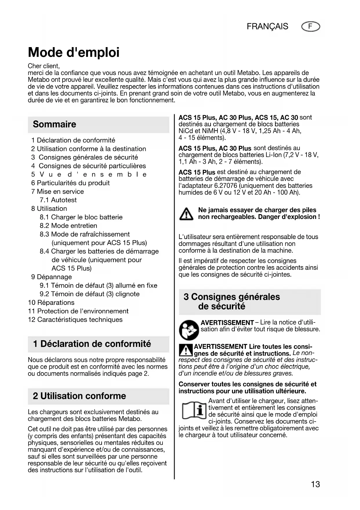 ACS 15 Plus, AC 30 Plus sont destinés au chargement de blocs batteries Li-Ion (7,2 V - 18 V, 1,1 Ah - 3 Ah, 2 - 7 éléments). ACS 15 Plus est destiné au chargement de batteries de démarrage de véhicule avec l'adaptateur 6.27076 (uniquement des batteries humides de 6 V ou 12 V et 20 Ah - 100 Ah). Ne jamais essayer de charger des piles non rechargeables. Danger d'explosion ! L'utilisateur sera entièrement responsable de tous dommages résultant d'une utilisation non conforme à la destination de la machine. Il est impératif de respecter les consignes générales de protection contre les accidents ainsi que les consignes de sécurité ci-jointes. AVERTISSEMENT – Lire la notice d'utili- sation afin d'éviter tout risque de blessure. AVERTISSEMENT Lire toutes les consi- gnes de sécurité et instructions. Le non- respect des consignes de sécurité et des instruc- tions peut être à l'origine d'un choc électrique, d'un incendie et/ou de blessures graves. Conserver toutes les consignes de sécurité et instructions pour une utilisation ultérieure. Avant d'utiliser le chargeur, lisez atten- tivement et entièrement les consignes de sécurité ainsi que le mode d'emploi ci-joints. Conservez les documents ci- joints et veillez à les remettre obligatoirement avec le chargeur à tout utilisateur concerné. Mode d'emploi Cher client, merci de la confiance que vous nous avez témoignée en achetant un outil Metabo. Les appareils de Metabo ont prouvé leur excellente qualité. Mais c'est vous qui avez la plus grande influence sur la durée de vie de votre appareil. Veuillez respecter les informations contenues dans ces instructions d'utilisation et dans les documents ci-joints. En prenant grand soin de votre outil Metabo, vous en augmenterez la durée de vie et en garantirez le bon fonctionnement. Sommaire 1 Déclaration de conformité 2 Utilisation conforme 3 Consignes générales de sécurité 17024963_0309 ACS 15 AC 30.book Seite 13 Mittwoch, 4. März 2009 4:29 1614 FRANÇAIS