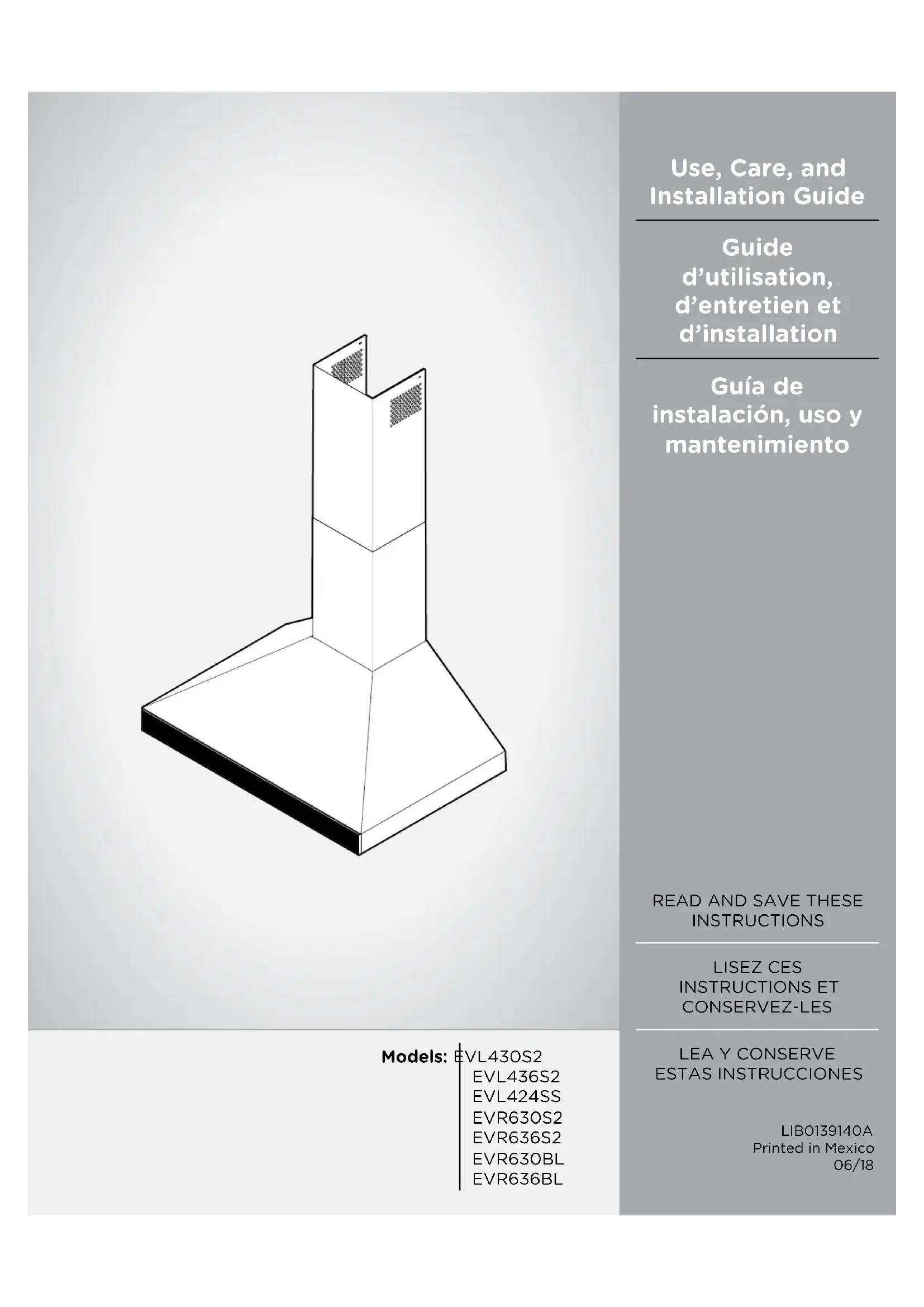 - Installer les filtres métalliques. Voir la section “Entretien”. REMARQUE: Pour pouvoir tirer le plus grand parti de la nou- velle hotte de cuisinière, lire la section “Entretien”. Description de la hotte Modelès EVR630 & EVR636