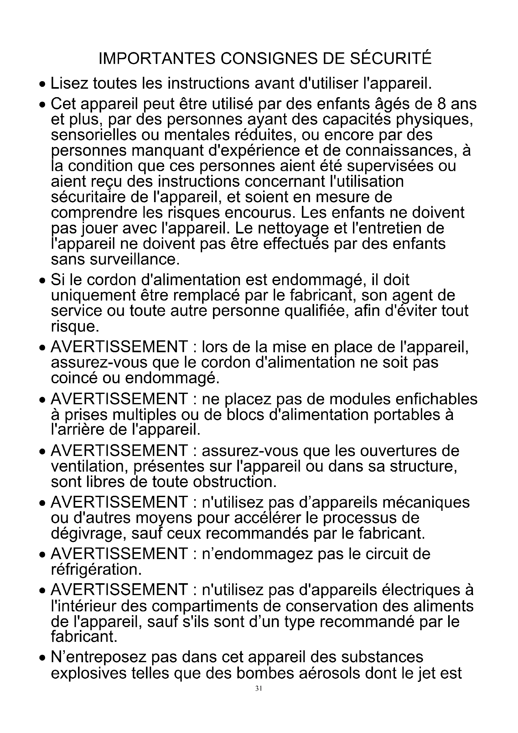 - N'entreposez pas dans cet appareil des substances explosives telles que des bombes aérosols dont le jet est