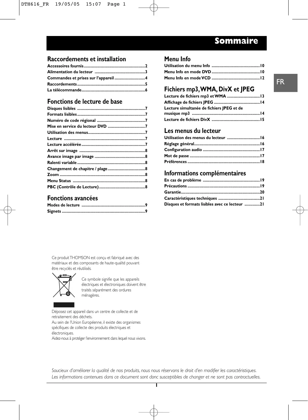 - DTH616_FR 19/05/05 15:07 Page 1 Sommaire Raccordements et installation Menu Info Accessoires fournis p. 2