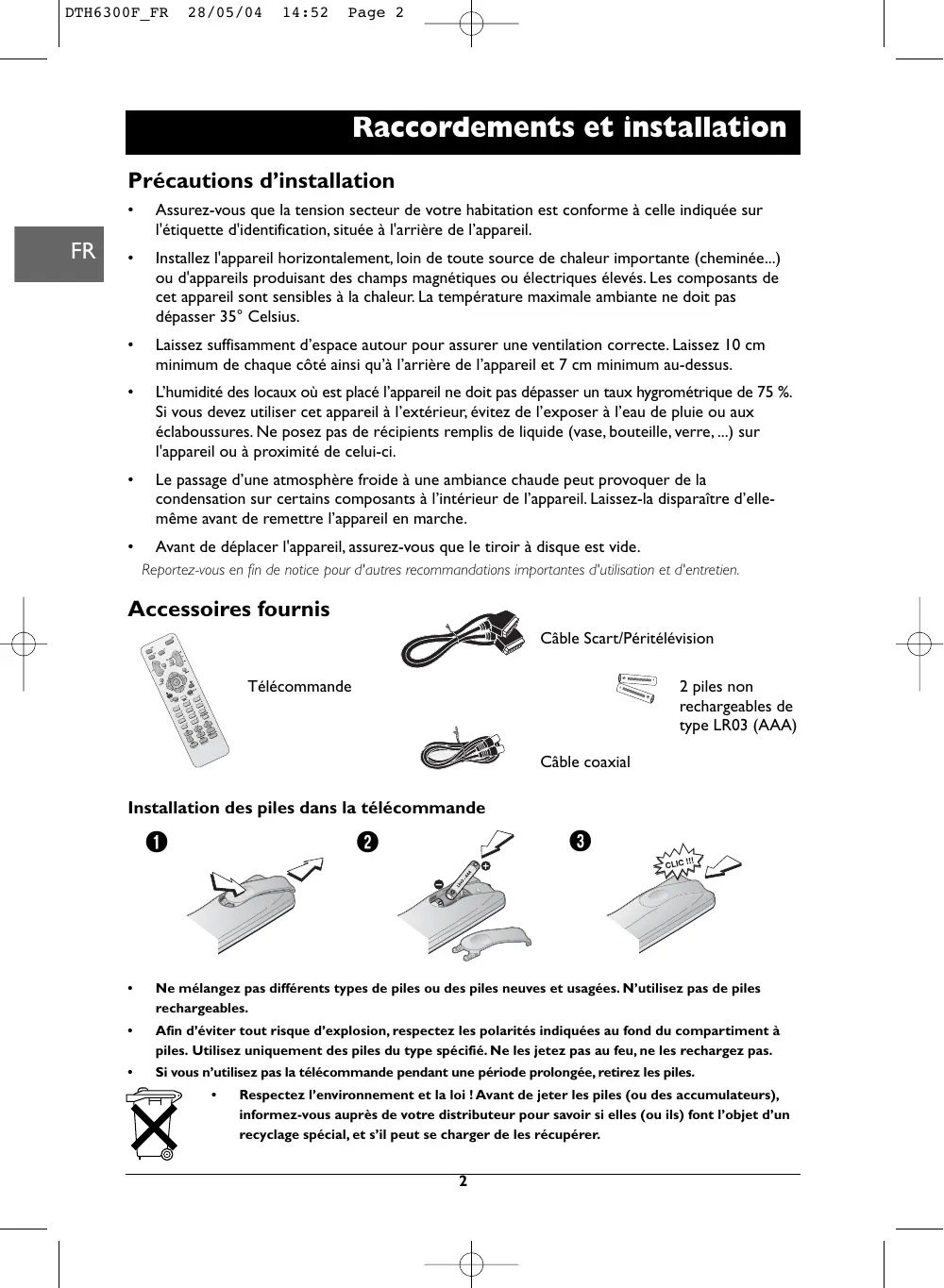 28/05/04 14:52 Page 2 Raccordements et installation Précautions d’installation Assurez-vous que la tension secteur de votre habitation est conforme à celle indiquée sur l'étiquette d'identification, située à l'arrière de l’appareil.