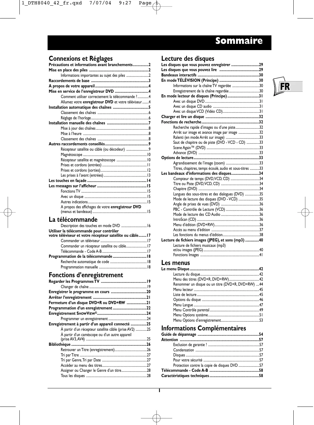 - 1_DTH8040_42_fr.qxd 7/07/04 9:27 Page 1 Sommaire Connexions et Réglages Lecture des disques Précautions et informations avant branchements p. 2