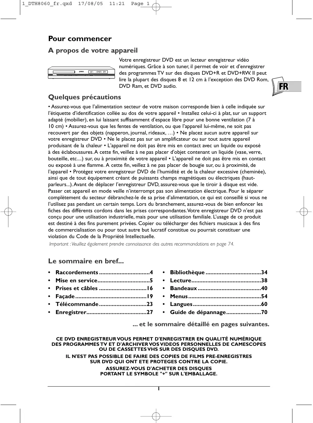 1_DTH8060_fr.qxd 17/08/05 11:21 Page 1 Pour commencer A propos de votre appareil Votre enregistreur DVD est un lecteur enregistreur vidéo numériques. Grâce à son tuner, il permet de voir et d’enregistrer des programmes TV sur des disques DVD+R et DVD+RW. Il peut lire la plupart des disques 8 et 12 cm à l’exception des DVD Rom, DVD Ram, et DVD audio. Quelques précautions