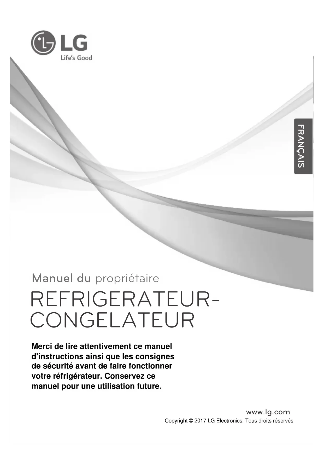 Merci de lire attentivement ce manuel d'instructions ainsi que les consignes de sécurité avant de faire fonctionner votre réfrigérateur. Conservez ce manuel pour une utilisation future. Manuel du propriétaire REFRIGERATEUR- CONGELATEUR FRANÇAIS www.lg.com Copyright © 2017 LG Electronics. Tous droits réservésINSTALLATION