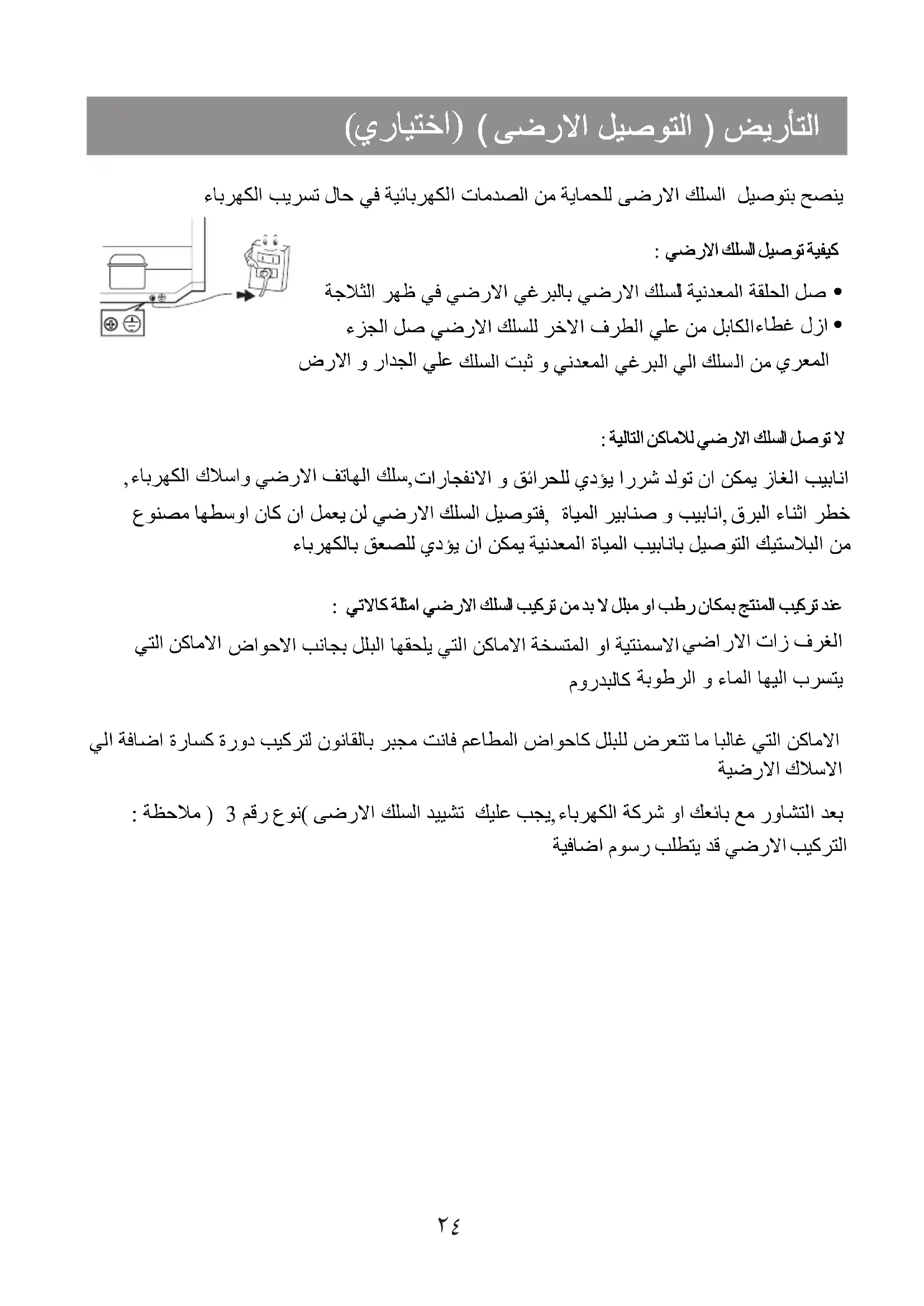 ٢Enlevez l’eau et la poussière de la prised’alimentation et insérez-la avec les boutsdes broches connectésavec sécurité. La poussière, l’eau ou une connexion instable peut provoquer du feu ou un choc électrique.Assurez-vous de la mise à la terre Une mise à la terre incorrecte peut produire une panne et un choc électrique. اﳌﻌﻠﻮﻣﺎت اﻟﻌﺎﻣﺔ