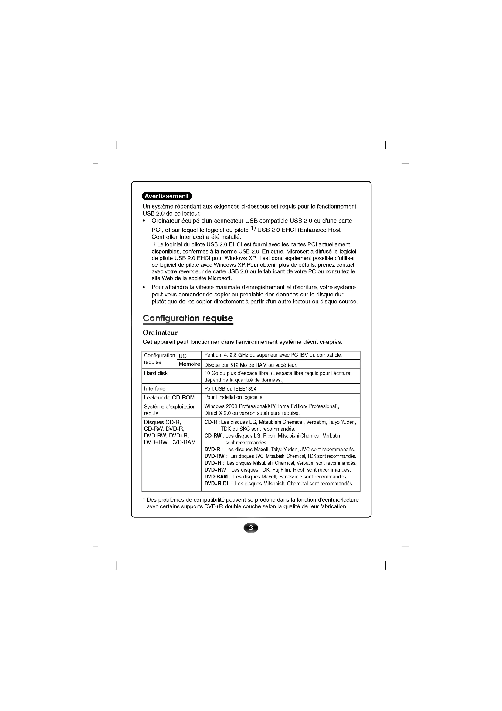 version superieure requise. CD-R Les disques LG, Mitsubishi Chemical, Verbatim, Taiyo Yuden, TDK SKC sont recommandes.CD-RW Les disques LG, Ricoh, Mitsubishi Chemical, Verbatim sont recommandes.DVD-R Les disques Maxell, Taiyo Yuden, JVC sont recommandes.DVD-RW Les disques JVC, Mitsubishi Chemical, TDK sont recommandes.DVD+R Les disques Mitsubishi Chemical, Verbatim sont recommandes.DVD+RW Les disques TDK, FujiFilm, Ricoh sont recommandes.DVD-RAM Les disques Maxell, Panasonic sont recommandes.DVD+RDL Les disques MitsubishiChemical sont recommandes. Configuration requise HarddiskInterfaceLecteurdeCD-ROM Systeme d'exploitation requis Disques CD-R, CD-RW, DVD-R, DVD-RW, DVD+R, DVD+RW, DVD-RAMUCMemoirePr cautions importantes Respectez ces consignes lorsdumaniementdulecteuroudes disques. Precautions Veuilleznoterquelefabricantdecet equipement n'offreaucune garantie quant