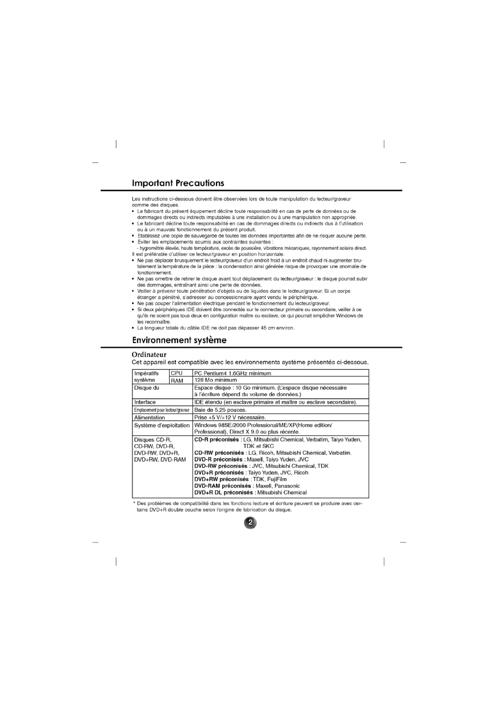 Manueldu lecteur/graveur Super MultiDVD1Lesinstructionsci-dessousdoiventetreobserveeslorsdetoute manipulation lecteur/graveur commedes disques. ?Lefabricantdu present equipement declinetoute responsabilite encasde perte dedonneesoude dommages directsouindirects imputables auneinstallationouaune manipulation non appropriee. ?Lefabricantdeclinetoute responsabilite encasde dommages directsouindirectsdusal'utilisationouaunmauvaisfonctionnementdu present produit. ?Etablissezune copie sauvegarde detouteslesdonnees importantes afindene risquer aucuneperte.?Eviterles emplacements soumisauxcontraintessuivantes:- hygrometrie elevee, haute temperature, excesde poussiere, vibrations mecaniques, rayonnement solairedirect.Ilest preferable d'utiliserce lecteur/graveur position horizontale.?Nepas deplacer brusquement lecteur/graveur d'unendroitfroidaunendroitchaudni augmenter bru-talementla temperature dela piece :lacondensationainsi generee risque deprovoqueruneanomaliedefonctionnement.?Nepasomettrederetirerle disque avanttout deplacement lecteur/graveur :le disque pourrait subirdes dommages, entrainantainsiunepertededonnees.?Veillera prevenir toute penetration d'objets oude liquides dansle lecteur/graveur. Siuncorps etranger penetre, s'adresserauconcessionnaire ayant vendule peripherique. ?Nepascouperl'alimentation electrique pendant lefonctionnementdu lecteur/graveur. ?Sideux peripheriques IDEdoiventetreconnectessurleconnecteur primaire secondaire, veillerace qu'ils nesoientpastousdeuxen configuration maitreou esclave, qui pourrait empecher Windowsdelesreconnaitre.?La longueur totaleducableIDEnedoitpas depasser 45cmenviron. Important Precautions Environnement syst me Ordinateur Cet appareil est compatible avec les environnements systeme presentes ci-dessous. PCPentium41.6GHzminimum128Mominimum Espace disque :10Gominimum. (L'espace disque necessaireal'ecriture depend duvolumede donnees.) IDEetendu (en esclave primaire etmaitreouesclave secondaire). Baiede 5,25 pouces.Prise+5V/+12Vnecessaire.Windows98SE/2000 Professional/ME/XP(Home edition/ Professional), DirectX9.0ou plus recente.CD-R preconises LG, Mitsubishi Chemical, Verbatim, Taiyo Yuden, TDKetSKCCD-RW preconises LG, Ricoh, Mitsubishi Chemical, Verbatim.DVD-R preconises Maxell, Taiyo Yuden, JVCDVD-RW preconises :JVC, Mitsubishi Chemical, TDKDVD+R preconises :Taiyo Yuden, JVC, RicohDVD+RW preconises TDK, FujiFilm DVD-RAM preconises Maxell, PanasonicDVD+RDL preconises :MitsubishiChemical Imperatifs systeme Disque duInterface Emplacement pour lecteur/graveur Alimentation Systeme d'exploitation Disques CD-R, CD-RW, DVD-R, DVD-RW, DVD+R, DVD+RW, DVD-RAMCPURAM*Des problemes compatibilite danslesfonctionslectureetecriture peuvent produire aveccer-tainsDVD+Rdoublecoucheselon l'origine defabricationdu disque.3 Danscertainscas,ilest impossible deliresurd'autreslecteurs*lesCD-RetlesCD-RW graves avec ce lecteur/graveur deCD-R/RW.Ces disques doiventetrelusavecle type delecteur ayant executelagravure.*Lesdisquesgravesavec celecteur/graveurdeCD-R/CD-RW sont susceptiblesdenepasetrelisiblesavecleslecteursdeCD-ROMdepourvusdelacompatibilitemultilecture(compatibiliteUDF).LesCD-ROMcompatiblesmultilecture(UDF) sont lessuivants: CD-ROMcapablesdelireenbassereflexion. CD-ROMgerantl'ecriturepar paquets. Remarque: Certains logiciels, (en particuliers ceux comprenant lafonctionvideo playback), exigent unPCvraiment performant en vued'atteinredebonsresultats.Afinquecelecteur Super MultiDVDliseles disques DVD video, enlesretranscrivantsurvotre moniteur, grace aunecarteMPEG separee, vousavezbesoinsoitd'un disque separe (ou unecarteMPEGou MPEG, decodage realiseparvotrecarte video), soitd'un logiciel separe quevousinstallerez. Logiciel Pour plus details, serefereraladocumentation qui vaavecle logiciel MPEG.Installerle logiciel d'enregistrement deCD/DVDavantdemettrele peripherique enservice. Implantation