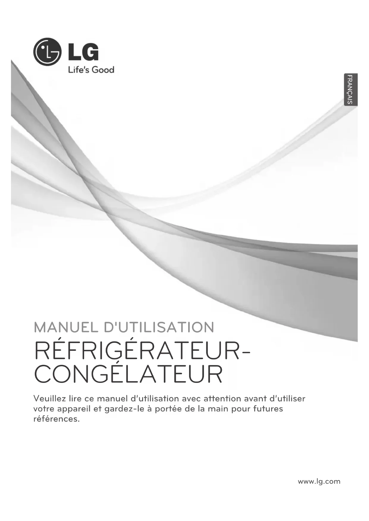 CONGÉLATEUR Veuillez lire ce manuel d’utilisation avec attention avant d’utiliser votre appareil et gardez-le à portée de la main pour futures références. P/No. : MFL64999702 www.lg.com FRANÇAISEnregistrement Ce modèle et le numéro de série sont trouvés sur l’arrière de l’unité. Ce numéro est unique à cette unité et n’est disponible pour aucune autre. Vous devriez enregistrer ces informations et les garder avec le guide comme preuve de votre achat. Agrafez le reçu ici. Date de l’achat : Vendeur : Adresse du vendeur : Téléphone du vendeur : Numéro du modèle : Numéro de série :3 Importantes mesures de sécurité Identifications des pièces Installation Démarrage Thermostat Congélation Express Fonction vacances Test automatique Fermeture Marche/Arrêt Compartiment réfrigérateur Alarme de la porte Boite à glaçons Décongélation Distributeur d’eau Range-bouteilles Clayette en verre amovible Compartiment congélateur Stockage de la nourriture Information générale Inversement des portes Nettoyage Dépannage Introduction Installation Fonctionnement Suggestion sur le Stockage de la nourriture Soins et Entretient Dépannage