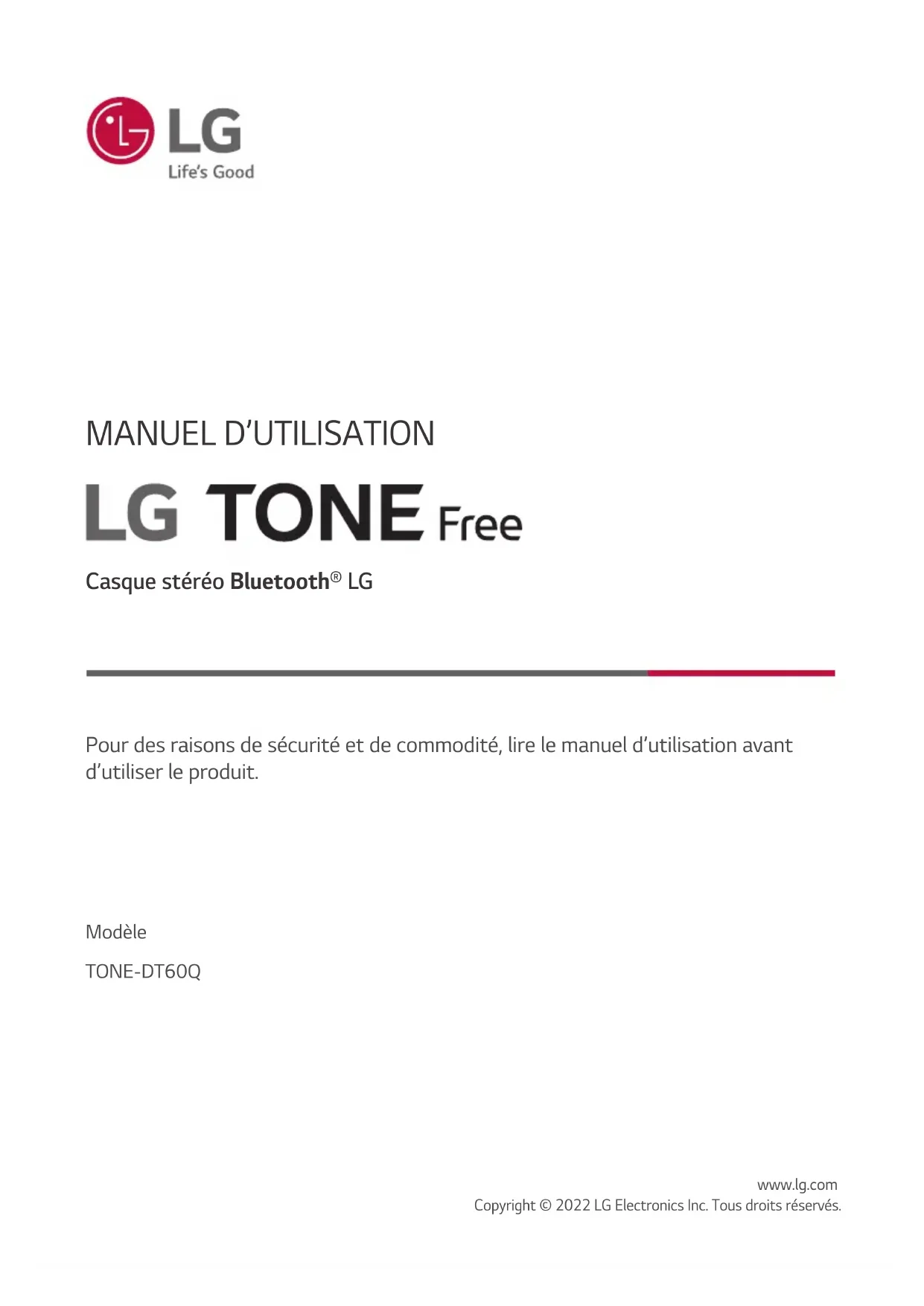 Pour des raisons de sécurité et de commodité, lire le manuel d’utilisation avant d’utiliser le produit. Modèle TONE-DT60Q Casque stéréo Bluetooth® LG www.lg.com Copyright © 2022 LG Electronics Inc. Tous droits réservés.2 Guide rapide Séquence facile d’utilisation