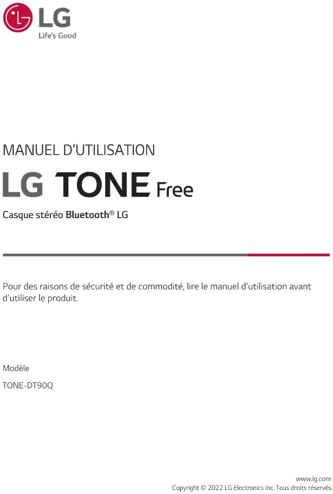 Pour des raisons de sécurité et de commodité, lire le manuel d’utilisation avant d’utiliser le produit. Modèle TONE-DT90Q Casque stéréo Bluetooth® LG www.lg.com Copyright © 2022 LG Electronics Inc. Tous droits réservés.2 Guide rapide Séquence facile d’utilisation