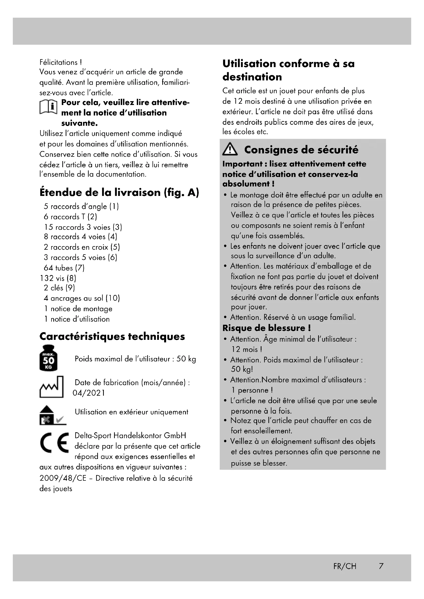 (7). Stockage, nettoyage Lorsque vous n’utilisez pas l’article, rangez-le toujours dans un endroit sec et propre à une température ambiante. Nettoyez uniquement avec de l’eau puis essuyez avec un chiffon de nettoyage. IMPORTANT ! Ne jamais laver avec des produits de nettoyage agressifs. FR/CH9FR/CH Mise au rebut Éliminez l‘article et le matériel d‘emballage conformément aux directives locales en vigueur. Le matériel d‘emballage tel que les sachets en plastique par exemple ne doivent pas arriver dans les mains des enfants. Conservez le maté- riel d‘emballage hors de portée des enfants. Ce produit est recyclable. Il est soumis à la responsabilité élargie du fabricant et est collecté séparément. Éliminez les produits et les emballages dans le respect de l‘environnement. Le code de recyclage est utilisé pour identifier les différents matériaux pour le retour dans le circuit de recyclage. Le code se compose du symbole de recyclage, qui doit correspondre au circuit de recyclage, et d‘un numéro identifiant le matériau. Indications concernant la garantie et le service après- vente L’article a été produit avec grand soin et sous un contrôle constant. DELTA-SPORT HANDELS- KONTOR GmbH accorde au client final privé une garantie de trois ans sur cet article à comp- ter de la date d’achat (période de garantie) conformément aux dispositions suivantes. La garantie ne vaut que pour les défauts de maté- riaux et de fabrication. La garantie ne couvre pas les pièces soumises à une usure normale, lesquelles doivent donc être considérées comme des pièces d’usure (comme par ex. les piles), de même qu’elle ne couvre pas les pièces fragiles, telles que les interrupteurs, les batteries ou les pièces fabriquées en verre. Les réclamations au titre de cette garantie sont exclues si l’article a été utilisé de manière abusive ou inappropriée, hors du cadre de son usage ou du champ d’application prévu ou si les instructions de la notice d’utilisation n’ont pas été respectées, à moins que le client final ne prouve que l´article présentait un défaut de matériau ou de fabrication n´étant pas dû à l’une des conditions mentionnées ci-dessus. Les réclamations au titre de la garantie ne peuvent être adressées pendant la période de garantie qu’en présentant le ticket de caisse original. Veuillez pour cela conserver le ticket de caisse original. Ceci s’applique également aux pièces remplacées et réparées. Si vous avez des plaintes à formuler, veuillez d’abord contacter le service d’assistance téléphonique ci-dessous ou nous contacter par courrier électronique. Si le cas est couvert par la garantie, nous nous engageons - à notre appréciation - à réparer ou à remplacer l’article gratuitement pour vous ou à vous rembourser le prix d’achat. Aucun autre droit ne découle de la garantie. Vos droits légaux, en particulier les droits de garantie contre le vendeur concerné, ne sont pas limités par cette garantie. Article L217-16 du Code de la consommation Lorsque l‘acheteur demande au vendeur, pendant le cours de la garantie commerciale qui lui a été consentie lors de l‘acquisition ou de la réparation d‘un bien meuble, une remise en état couverte par la garantie, toute période d‘immo- bilisation d‘au moins sept jours vient s‘ajouter à la durée de la garantie qui restait à courir. Cette période court à compter de la demande d‘intervention de l‘acheteur ou de la mise à disposition pour réparation du bien en cause, si cette mise à disposition est postérieure à la demande d‘intervention. Indépendamment de la garantie commerciale souscrite, le vendeur reste tenu des défauts de conformité du bien et des vices rédhibitoires dans les conditions prévues aux articles L217-4 à L217-13 du Code de la consommation et aux articles 1641 à 1648 et 2232 du Code Civil. Article L217-4 du Code de la consommation Le vendeur livre un bien conforme au contrat et répond des défauts de conformité existant lors de la délivrance.10 Il répond également des défauts de conformité résultant de l‘emballage, des instructions de montage ou de l‘installation lorsque celle-ci a été mise à sa charge par le contrat ou a été réalisée sous sa responsabilité. Article L217-5 du Code de la consommation Le bien est conforme au contrat : 1° S´il est propre à l‘usage habituellement attendu d‘un bien semblable et, le cas échéant :