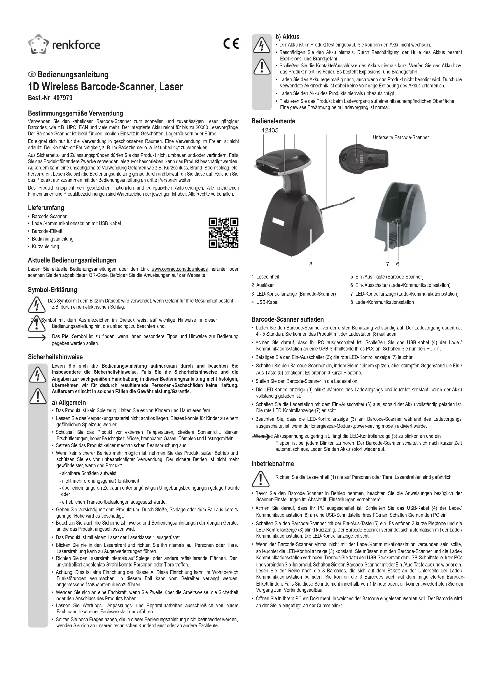 - Appuyez sur le bouton de déclenchement (2) pour lire le code-barres. Si la lecture est réussie, un signal sonore retentit et le voyant de contrôle à diode LED (3) s‘allume brièvement en vert. Le code-barres est automatiquement lu. S’il est impossible de lire le code-barres, le voyant de contrôle LED s‘allume brièvement en rouge. Mode d’emploi Scanner de codes barres sans l 1D, laser Nº de commande : 407979 Utilisation prévue Utilisez le scanner de codes barres sans l pour la lecture rapide et able de codes barres standards, tels que UPC, EAN et bien d‘autres. L’accumulateur intégré dure jusqu‘à 20000 opérations de lecture. Le scanner de codes barres est idéal pour une utilisation mobile dans des magasins, entrepôts ou bureaux. Il est uniquement prévu pour une utilisation en intérieur. L’utilisation en plein air est interdite. Évitez impérativement tout contact avec l’humidité, par ex. dans la salle de bains, etc. Pour des raisons de sécurité et d’homologation, toute transformation et/ou modication du produit est interdite. Toute utilisation autre que celle décrite précédemment risque d’endommager le produit. Par ailleurs, une utilisation incorrecte peut être source de dangers tels que les courts-circuits, les incendies, l’électrocution. Lisez attentivement le mode d’emploi et conservez-le. Ne transmettez le produit à des tiers qu’accompagné de son mode d’emploi. Le produit est conforme aux exigences des directives européennes et nationales en vigueur. Tous les noms d’entreprises et appellations de produits contenus dans ce mode d’emploi sont des marques déposées de leurs propriétaires respectifs. Tous droits réservés. Contenu d’emballage