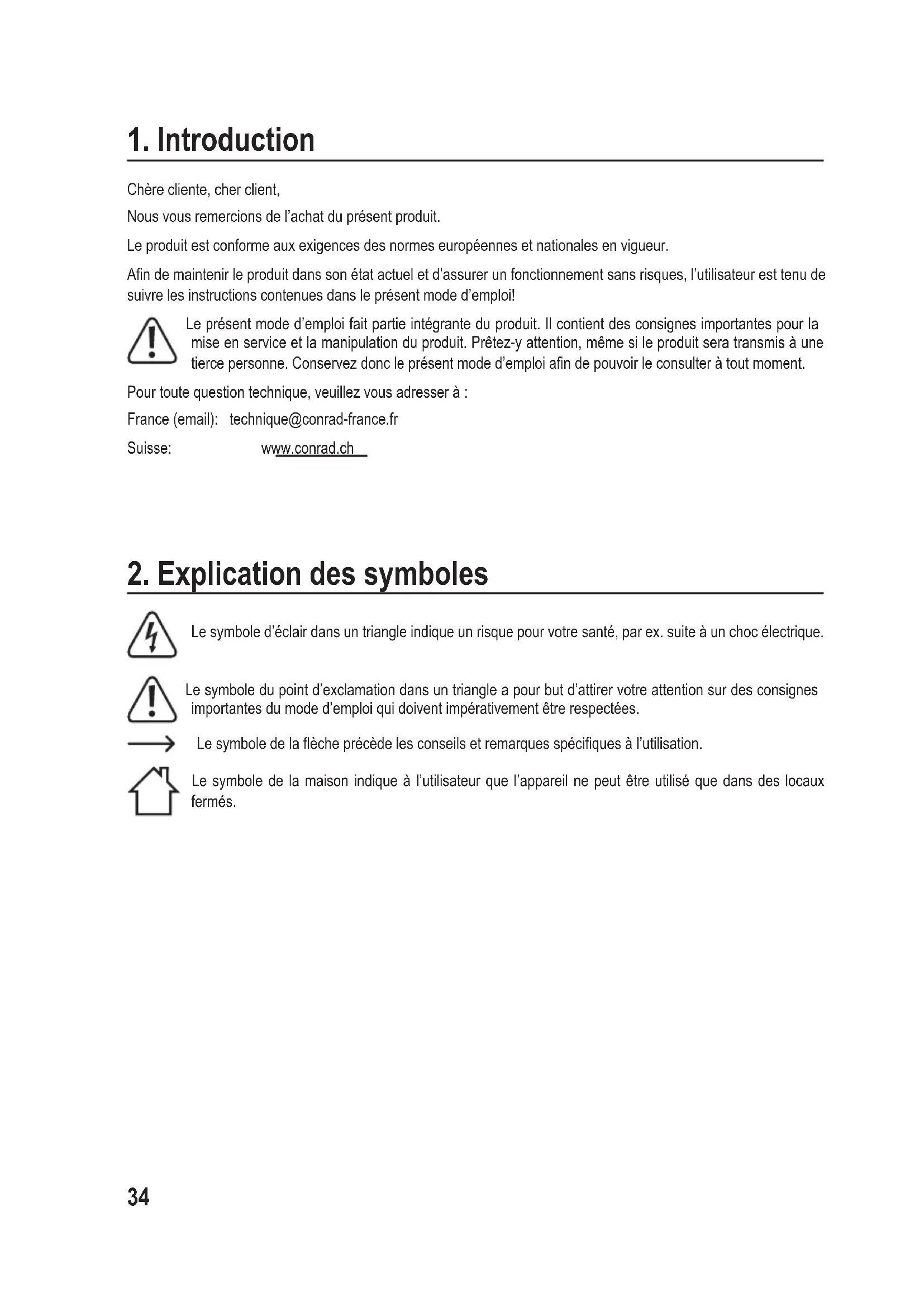 Chère cliente, cher client, Nous vous remercions de l’achat du présent produit. Le produit est conforme aux exigences des normes européennes et nationales en vigueur. Andemaintenirleproduitdanssonétatactueletd’assurerunfonctionnementsansrisques,l’utilisateuresttenude suivre les instructions contenues dans le présent mode d’emploi! Le présent mode d’emploi fait partie intégrante du produit. Il contient des consignes importantes pour la mise en service et la manipulation du produit. Prêtez-y attention, même si le produit sera transmis à une tiercepersonne.Conservezdoncleprésentmoded’emploiandepouvoirleconsulteràtoutmoment. Pour toute question technique, veuillez vous adresser à : France (email): technique@conrad-france.fr Suisse: www.conrad.ch