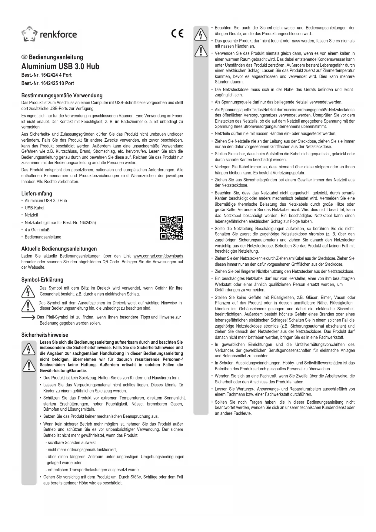 - Si vous avez d’autres questions auxquelles ce mode d’emploi n’a pas su répondre, nous vous prions de vous adresser à notre service technique ou à un expert. Mode d’emploi Concentrateur USB 3.0 en aluminium Nº de commande 1642424 4 ports Nº de commande 1642425 10 ports Utilisation prévue Le produit est destiné à être connecté à un ordinateur muni d‘une interface USB permettant ainsi de disposer de ports USB supplémentaires. Il est uniquement prévu pour une utilisation en intérieur. L’utilisation en plein air est interdite. Évitez impérativement tout contact avec l’humidité, par ex. dans la salle de bains, etc. Pour des raisons de sécurité et d’homologation, toute transformation et/ou modication du produit est interdite. Toute utilisation autre que celle décrite précédemment risque d’endommager le produit. Par ailleurs, une utilisation incorrecte peut être source de dangers tels que les courts-circuits, les incendies, l’électrocution. Lisez attentivement le mode d’emploi et conservez-le. Ne transmettez le produit à des tiers qu’accompagné de son mode d’emploi. Le produit est conforme aux exigences des directives européennes et nationales en vigueur. Tous les noms d’entreprises et appellations de produits contenus dans ce mode d’emploi sont des marques déposées de leurs propriétaires respectifs. Tous droits réservés. Contenu d’emballage