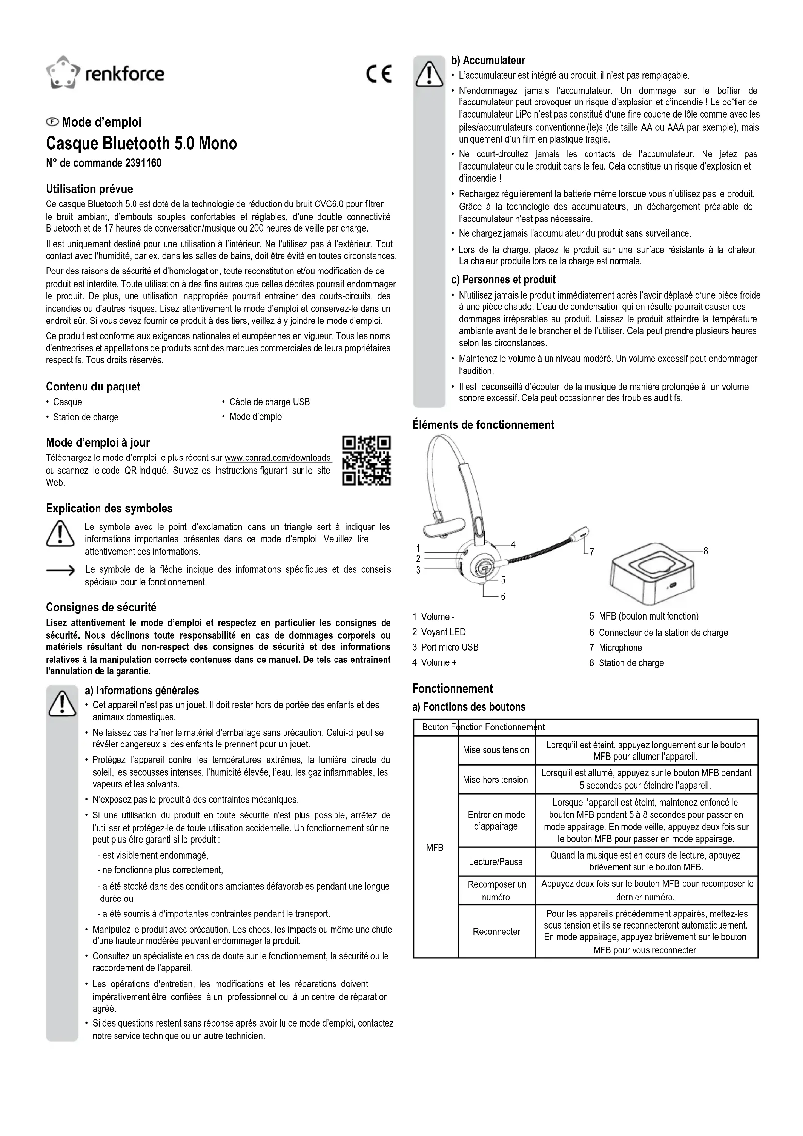 1 Volume - 2 Voyant LED 3 Port micro USB 4 Volume + 5 MFB (bouton multifonction) 6 Connecteur de la station de charge 7 Microphone 8 Station de charge Fonctionnement a) Fonctions des boutons Bouton Fonction Fonctionnement MFB Mise sous tension Lorsqu’il est éteint, appuyez longuement sur le bouton MFB pour allumer l’appareil. Mise hors tension Lorsqu’il est allumé, appuyez sur le bouton MFB pendant 5 secondes pour éteindre l’appareil. Entrer en mode d’appairage Lorsque l’appareil est éteint, maintenez enfoncé le bouton MFB pendant 5 à 8 secondes pour passer en mode appairage. En mode veille, appuyez deux fois sur le bouton MFB pour passer en mode appairage. Lecture/Pause Quand la musique est en cours de lecture, appuyez brièvement sur le bouton MFB. Recomposer un numéro Appuyez deux fois sur le bouton MFB pour recomposer le dernier numéro. Reconnecter Pour les appareils précédemment appairés, mettez-les sous tension et ils se reconnecteront automatiquement. En mode appairage, appuyez brièvement sur le bouton MFB pour vous reconnecter Mode d’emploi Casque Bluetooth 5.0 Mono N° de commande 2391160 Utilisation prévue Ce casque Bluetooth 5.0 est doté de la technologie de réduction du bruit CVC6.0 pour ltrer le bruit ambiant, d’embouts souples confortables et réglables, d’une double connectivité Bluetooth et de 17 heures de conversation/musique ou 200 heures de veille par charge. Il est uniquement destiné pour une utilisation à l’intérieur. Ne l'utilisez pas à l’extérieur. Tout contact avec l'humidité, par ex. dans les salles de bains, doit être évité en toutes circonstances. Pour des raisons de sécurité et d’homologation, toute reconstitution et/ou modication de ce produit est interdite. Toute utilisation à des ns autres que celles décrites pourrait endommager le produit. De plus, une utilisation inappropriée pourrait entraîner des courts-circuits, des incendies ou d’autres risques. Lisez attentivement le mode d’emploi et conservez-le dans un endroit sûr. Si vous devez fournir ce produit à des tiers, veillez à y joindre le mode d’emploi. Ce produit est conforme aux exigences nationales et européennes en vigueur. Tous les noms d’entreprises et appellations de produits sont des marques commerciales de leurs propriétaires respectifs. Tous droits réservés. Contenu du paquet