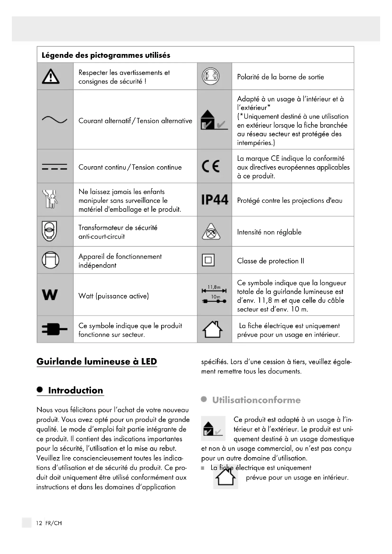 ou le produit avec des mains mouillées. Le produit ne doit pas être raccordé électrique- ment à d‘autres guirlandes électriques. En cas de non utilisation prolongée, débran- chez le produit du secteur. Si vous avez des questions concernant le produit, ou si vous n‘êtes pas sûrs, demandez conseil à un électricien. Utilisez uniquement le produit avec l‘alimentation électrique