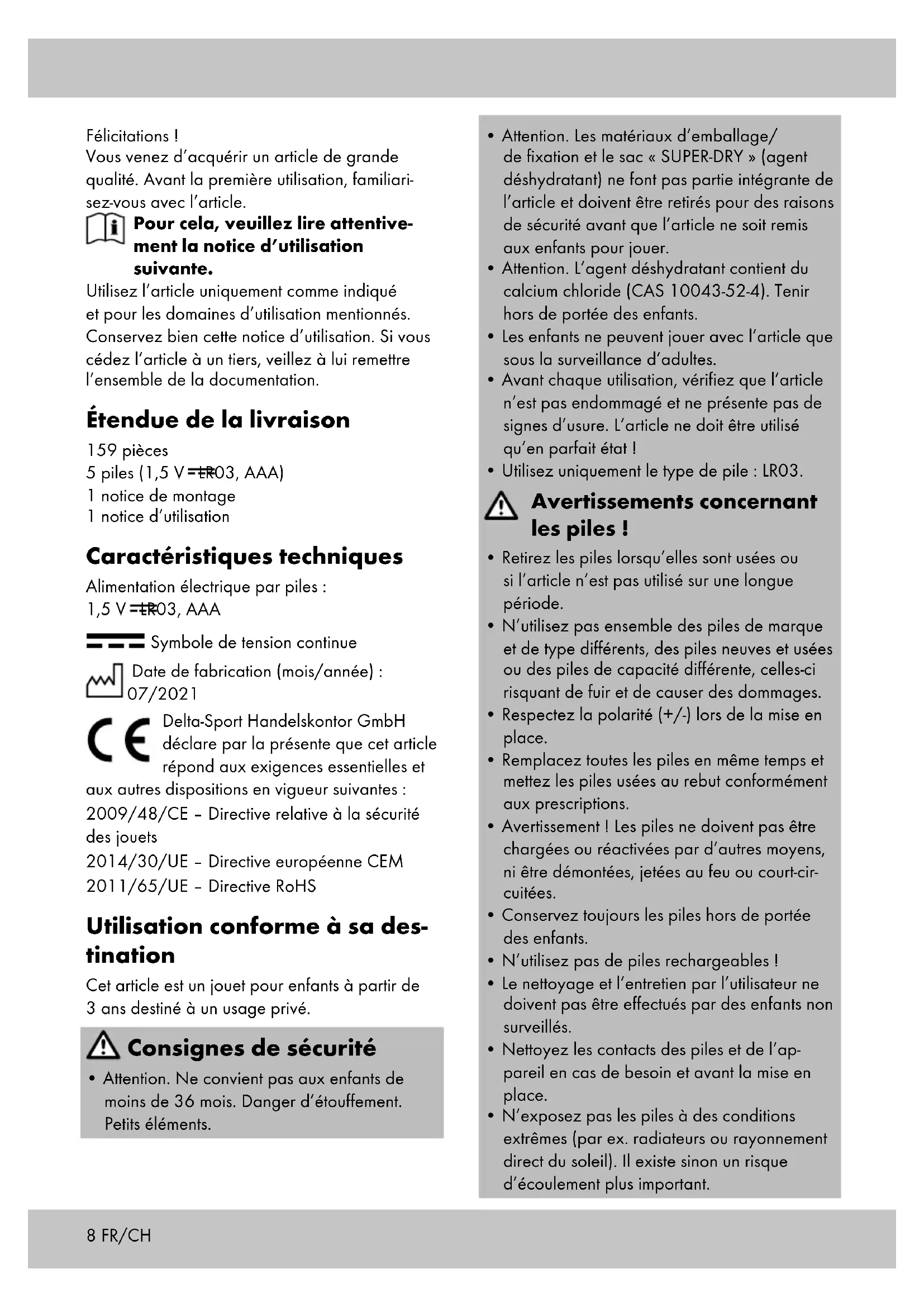 Symbole de tension continue Date de fabrication (mois/année) : 07/2021 Delta-Sport Handelskontor GmbH déclare par la présente que cet article répond aux exigences essentielles et aux autres dispositions en vigueur suivantes : 2009/48/CE – Directive relative à la sécurité des jouets 2014/30/UE – Directive européenne CEM 2011/65/UE – Directive RoHS Utilisation conforme à sa des- tination Cet article est un jouet pour enfants à partir de 3 ans destiné à un usage privé. Consignes de sécurité