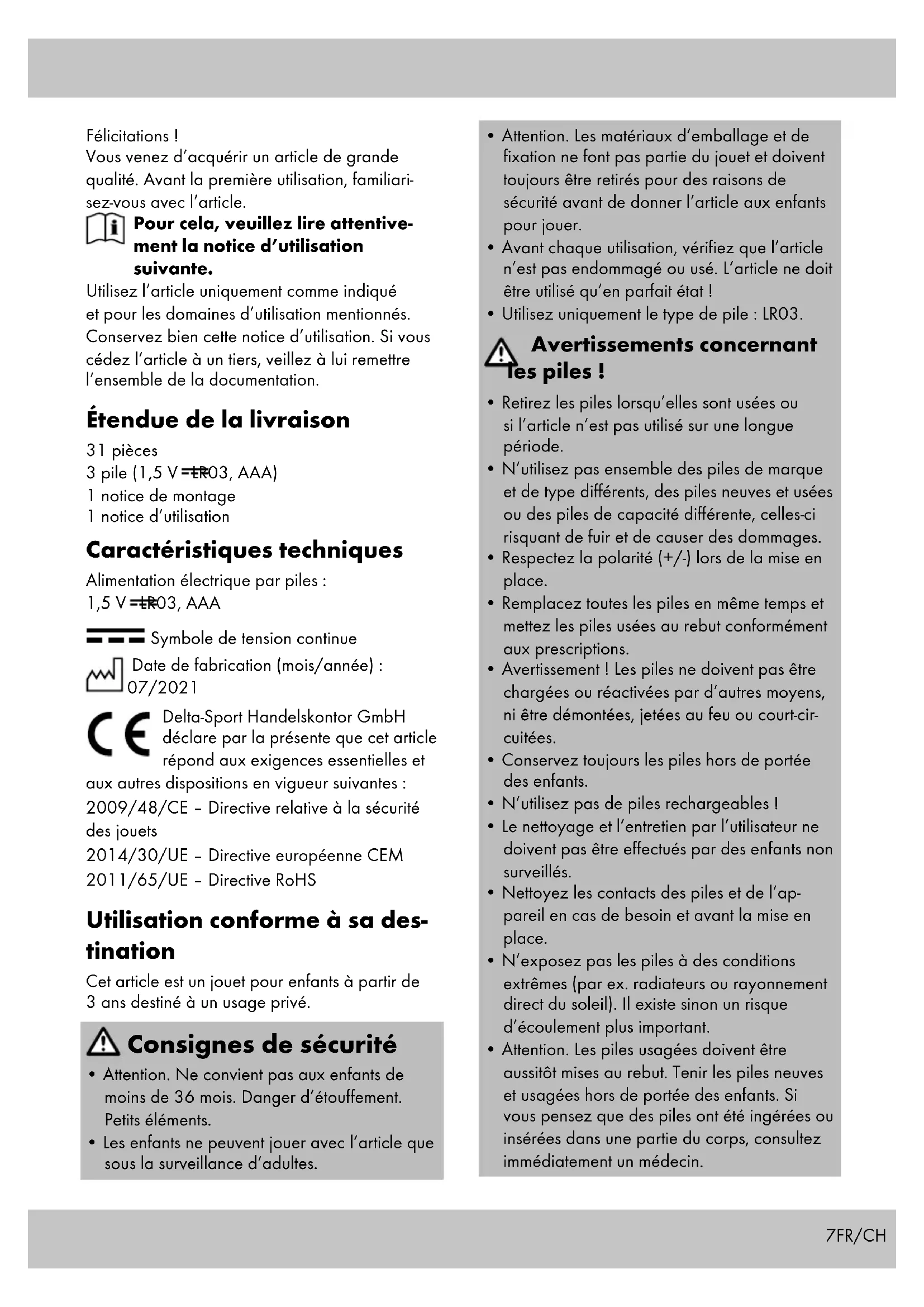 Symbole de tension continue Date de fabrication (mois/année) : 07/2021 Delta-Sport Handelskontor GmbH déclare par la présente que cet article répond aux exigences essentielles et aux autres dispositions en vigueur suivantes : 2009/48/CE – Directive relative à la sécurité des jouets 2014/30/UE – Directive européenne CEM 2011/65/UE – Directive RoHS Utilisation conforme à sa des- tination Cet article est un jouet pour enfants à partir de 3 ans destiné à un usage privé. Consignes de sécurité