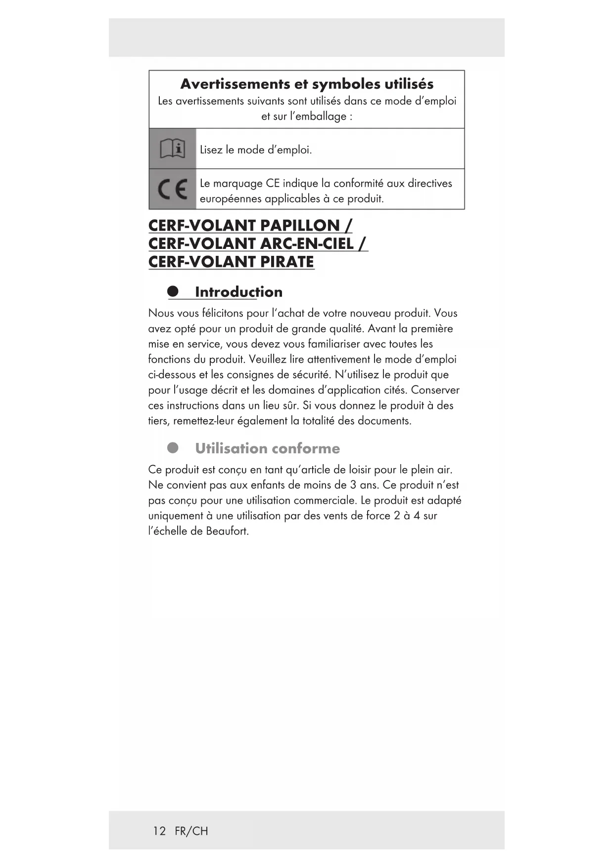 FORT ! Respecter les conditions de vol adéquates en fonction de votre niveau de pilotage et des caractéristiques du cerf- volant. Surveiller spécialement les enfants lorsqu‘ils jouent avec le cerf-volant. Ne jamais faire décoller un cerf-volant que vous-même ou vos enfants ne peuvent pas maîtriser. Tenir compte de la force du vent et des coups de vent éventuels. Les enfants doivent être surveillés en permanence par un adulte lorsqu‘ils jouent avec le produit. Ne pas utiliser le produit dans des conditions météo telles que : pluie, tempête, orage. Avant chaque utilisation du produit, il convient de s‘informer des prévisions météo actuelles. Ne pas fixer d‘autres cerfs-volants aux lignes. Uniquement utiliser le produit dans des zones où le pilotage de cerf-volant est autorisé. Tenir compte que ceci n‘est par ex. pas le cas pour toutes les plages. Avant d‘utiliser le produit, veuillez vous informer auprès la mairie ou des autorités municipales. Avant chaque utilisation, vérifier que tous les connecteurs et les lignes sont en parfait état.15 FR/CH Montage Montez le produit conformément aux ill. B et C. Utilisation Force du vent 0 Bft (Calme) La fumée s’élève verticalement, aucun mouvement dans l’air Les cerfs-volants voleront uniquement à l’aide d’un support 1 Bft (Vent faible) La fumée part à dérive Convient aux cerfs-volants très légers 2 Bft (Brise légère) Bruissement des feuilles, vent perceptible sur la peau Idéal pour les professionnels 3 Bft (Petite brise) Les feuilles et les brindilles s’agitent Vent portant pour débutants 4 Bft (Brise modérée) Les petites branches remuent, le papier libre se soulève Idéal pour les cerfs-volants de taille moyenne 5 Bft (Bonne brise) Les grosses branches et les petits arbres se balancent Les grands cerfs-volants risquent de s’endommager 6 Bft (Puissante brise) Les grosses branches bougent, le vent siffle Limite pour tous les cerfs-volants rigides 7 Bft (Grand vent) L’arbre tout entier bouge Convient uniquement à des cerfs-volant de puissance et aux professionnels16 FR/CH Décollage Deux personnes (débutant) : Se placer dos au vent et saisir fermement la bobine. Le partenaire doit maintenir le cerf-volant et s‘éloigner d‘env. 20 m dans la direction du vent. La ligne se déroule de la bobine. Maintenir la ligne tendue. Donner le signal au partenaire lorsqu‘il doit lâcher le cerf- volant. Il doit immédiatement s‘éloigner de la zone d‘évolution du cerf-volant et de la ligne. Faire quelques pas en reculant, dos au vent. Le cerf-volant doit s‘élever. Une personne (pilote avancé) : Dérouler env. 2 m de ligne et poser le cerf-volant au sol à env. 2 m devant soi avec l‘extrados vers le haut. Saisir fermement la bobine. Tirer sec sur la bobine du cerf-volant. Le cerf-volant doit s‘élever. Atterrissage Vérifier que vous disposer d‘un espace suffisant pour atterrir de manière à ne blesser personne. Piloter le cerf-volant au bord de la fenêtre de vol et dérouler rapidement la ligne pour la détendre. Se placer en travers du vent. Demander à une deuxième personne de tenir le cerf-volant pendant que vous rembobinez la ligne, de manière à ce que le cerf-volant ne puisse pas redécoller involontairement pendant cette opération. Nettoyage et entretien Enlevez la saleté qui se trouve sur le produit à l’aide d’un chiffon humide et de l’eau savonneuse. N’utilisez aucun produit de nettoyage agressif. Veuillez conserver le produit dans un endroit sec et à l’abri de la lumière. Mise au rebut L’emballage se compose de matières recyclables pouvant être mises au rebut dans les déchetteries locales. Votre mairie ou votre municipalité vous renseigneront sur les possibilités de mise au rebut des produits usagés.17 FR/CH Garantie Le produit a été fabriqué selon des critères de qualité stricts et contrôlé consciencieusement avant sa livraison. En cas de défaillance, vous êtes en droit de retourner ce produit au vendeur. La présente garantie ne constitue pas une restriction de vos droits légaux. Ce produit bénéficie d‘une garantie de 3 ans à compter de sa date d’achat. La durée de garantie débute à la date d’achat. Veuillez conserver le ticket de caisse original. Il fera office de preuve d’achat. Si un problème matériel ou de fabrication devait survenir dans 3 ans suivant la date d‘achat de ce produit, nous assurons à notre discrétion la réparation ou le remplacement du produit sans frais supplémentaires. La garantie prend fin si le produit est endommagé suite à une utilisation inappropriée ou à un entretien défaillant. La garantie couvre les vices matériels et de fabrication. Cette garantie ne s’étend ni aux pièces du produit soumises à une usure normale (p. ex. des piles) et qui, par conséquent, peuvent être considérées comme des pièces d’usure, ni aux dommages sur des composants fragiles, comme des interrupteurs, des batteries ou des éléments fabriqués en verre.18 FR/CH Faire valoir sa garantie Pour garantir la rapidité d’exécution de la procédure de garantie, veuillez respecter les indications suivantes : Veuillez conserver le ticket de caisse et la référence du produit (IAN 402880_2110) à titre de preuve d’achat pour toute demande. Le numéro de référence de l’article est indiqué sur la plaque d’identification, gravé sur la page de titre de votre manuel (en bas à gauche) ou sur un autocollant apposé sur la face arrière ou inférieure du produit. En cas de dysfonctionnement du produit, ou de tout autre défaut, contactez en premier lieu le service après-vente par téléphone ou par e-mail aux coordonnées indiquées ci-dessous. Vous pouvez alors envoyer franco de port tout produit considéré comme défectueux au service clientèle indiqué, accompagné de la preuve d’achat (ticket de caisse) et d’une description écrite du défaut avec mention de sa date d’apparition. Servi