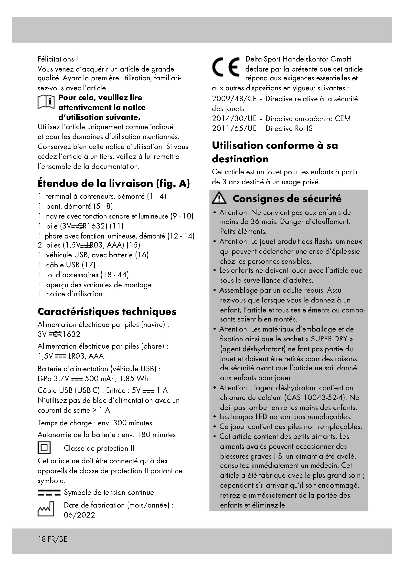 phare avec fonction lumineuse, démonté (12 - 14) 2 piles (1,5V LR03, AAA) (15) 1 véhicule USB, avec batterie (16) 1 câble USB (17) 1 lot d’accessoires (18 - 44) 1 aperçu des variantes de montage 1 notice d’utilisation Caractéristiques techniques Alimentation électrique par piles (navire) : 3V CR1632 Alimentation électrique par piles (phare) : 1,5V LR03, AAA Batterie d’alimentation (véhicule USB) : Li-Po 3,7V 500 mAh, 1,85 Wh Câble USB (USB-C) : Entrée : 5V 1 A N’utilisez pas de bloc d’alimentation avec un courant de sortie > 1 A. Temps de charge : env. 300 minutes Autonomie de la batterie : env. 180 minutes Classe de protection II Cet article ne doit être connecté qu’à des appareils de classe de protection II portant ce symbole. Symbole de tension continue Date de fabrication (mois/année) : 06/2022 Delta-Sport Handelskontor GmbH déclare par la présente que cet article répond aux exigences essentielles et aux autres dispositions en vigueur suivantes : 2009/48/CE – Directive relative à la sécurité des jouets 2014/30/UE – Directive européenne CEM 2011/65/UE – Directive RoHS Utilisation conforme à sa destination Cet article est un jouet pour les enfants à partir de 3 ans destiné à un usage privé. Consignes de sécurité