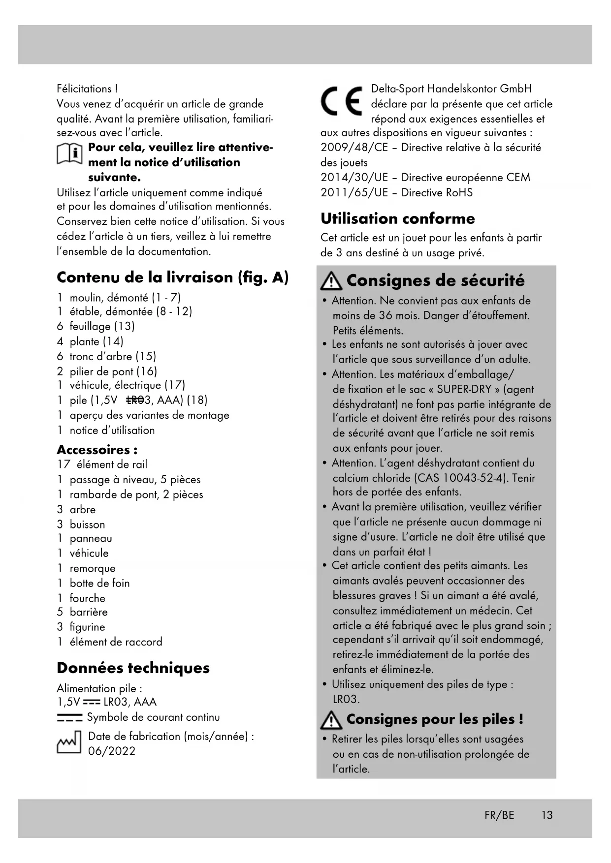 - s‘il présente les qualités qu‘un acheteur peut légitimement attendre eu égard aux déclara- tions publiques faites par le vendeur, par le producteur ou par son représentant, notam- ment dans la publicité ou l‘étiquetage ; 2° Ou s‘il présente les caractéristiques définies d‘un commun accord par les parties ou être propre à tout usage spécial recherché par l‘acheteur, porté à la connaissance du vendeur et que ce dernier a accepté. Article L217-12 du Code de la consommation L‘action résultant du défaut de conformité se prescrit par deux ans à compter de la délivrance du bien. Article 1641 du Code civil Le vendeur est tenu de la garantie à raison des défauts cachés de la chose vendue qui la rendent impropre à l‘usage auquel on la destine, ou qui diminuent tellement cet usage que l‘acheteur ne l‘aurait pas acquise, ou n‘en aurait donné qu‘un moindre prix, s‘il les avait connus. Article 1648 1er alinéa du Code civil L‘action résultant des vices rédhibitoires doit être intentée par l‘acquéreur dans un délai de deux ans à compter de la découverte du vice. Les pièces détachées indispensables à l’utili- sation du produit sont disponibles pendant la durée de la garantie du produit. IAN : 391028_2201 Service France Tel. : 0800 919270 E-Mail : deltasport@lidl.fr Service Belgique Tel. : 0800 12089 E-Mail : deltasport@lidl.be17NL/BE Gefeliciteerd! Met uw aankoop hebt u voor een hoogwaardig artikel gekozen. Zorg ervoor dat u voor het eerste gebruik met het artikel vertrouwd raakt. Lees hiervoor de volgende gebruiksaanwijzing zorgvuldig door. Gebruik het artikel alleen zoals omschreven en voor het aangegeven doel. Bewaar deze ge- bruiksaanwijzing goed. Geef alle documenten mee als u het artikel aan iemand anders geeft. In het leveringspakket inbegrepen (afb. A) 1 x molen, gedemonteerd (1 - 7) 1 x hok, gedemonteerd (8 - 12) 6 x kruin (13) 4 x plant (14) 6 x boomstam (15) 2 x brugsteun (16) 1 x voertuig, elektrisch (17) 1 x batterij (1,5V LR03, AAA) (18) 1 x overzicht opbouwvarianten 1 x gebruiksaanwijzing Accessoires: 17 x railelement 1 x spoorwegovergang, 5-delig 1 x brugleuning, 2-delig 3 x boom 3 x struik 1 x bord 1 x voertuig 1 x aanhangwagen 1 x strobaal 1 x mestvork 5 x omheining 3 x figuur 1 x verbindingsstuk Technische gegevens Energievoorziening batterij: