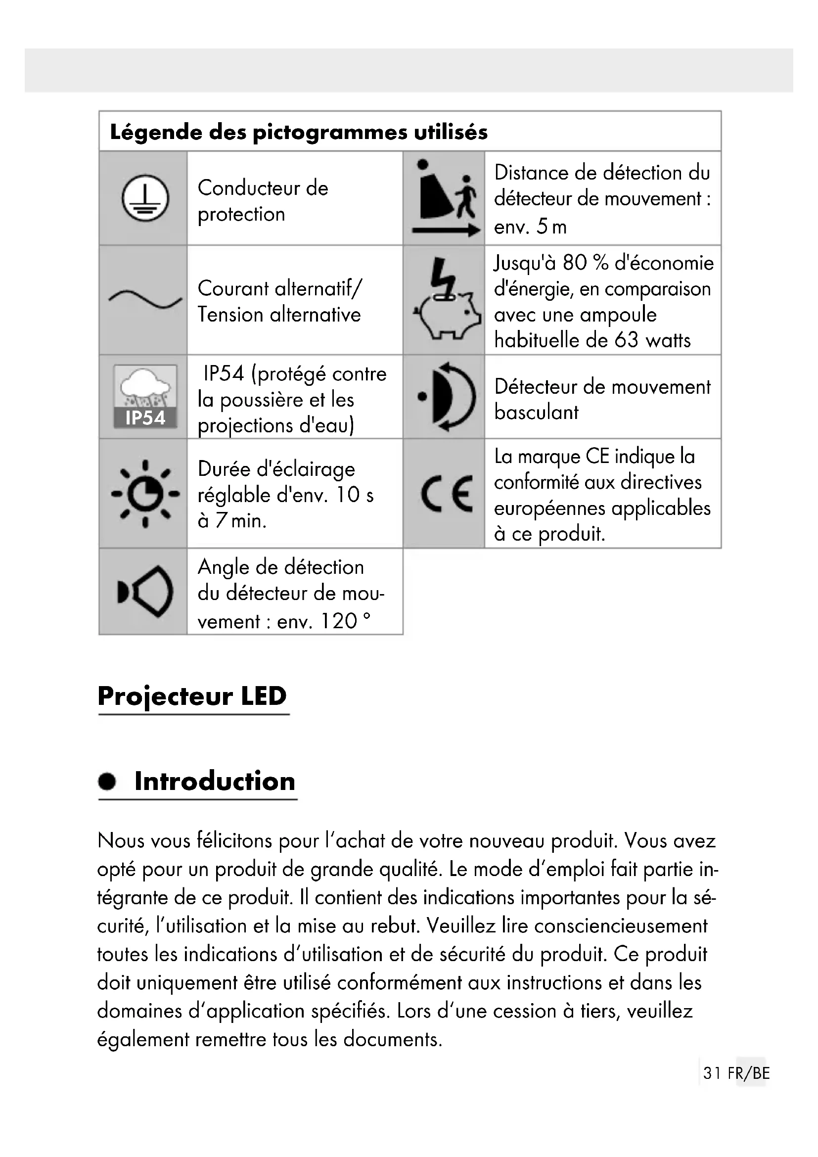 Hauteur de montage : env. 2,5 m33 FR/BE Poids : env. 305 g Certifié GS Ce produit contient une source lumineuse de classe d’efficacité énergétique «F». Contenu de la livraison 1 Projecteur d‘extérieur LED avec détecteur de mouvement 2 Chevilles (Ø 6 mm) 2 Vis 1 Notice d‘utilisation et de montage Instructions générales de sécurité Prenez connaissance de toutes les indications de maniement et de sécurité avant d‘utiliser l‘appareil pour la première fois ! Transmettez également tous les documents en cas de transmission du produit à une personne tierce ! DANGER DE MORT ET D’ACCIDENT POUR LES ENFANTS EN BAS ÂGE ET LES ENFANTS! Ne laissez jamais les enfants jouer sans surveillance avec l’emballage. Ils peuvent s‘étouffer avec les emballages. Les enfants sous-estiment souvent le danger. Toujours tenir l‘appareil à l‘écart des enfants. Ce produit peut être utilisé par des enfants âgés de 8 ans et plus ainsi que par des personnes ayant des capacités physiques, senso- rielles ou mentales réduites ou manquant d‘expérience ou de connais- sances, à la condition qu‘ils soient surveillés ou s‘ils ont été34 FR/BE informés de l‘utilisation sûre du produit et s‘ils en comprennent les risques liés à son utilisation. Les enfants ne doivent pas jouer avec le produit. Le nettoyage et l‘entretien du produit ne doivent pas être effectués par des enfants laissés sans surveillance. Danger de mort par électrocution Avant chaque branchement sur secteur, contrôlez le bon état du produit. Ne jamais utiliser le produit si vous détectez le moindre endommagement. Avant le montage, vérifiez que la tension secteur corresponde à la tension de service requise du produit (230 V∼ 50 Hz). Si ce n‘est pas le cas, ne pas monter le produit. Le domino de raccordement ne fait pas partie de la livraison. L’installation doit être effectuée par du personnel qualifié. ATTENTION ! RISQUE DE BRÛLURES! Vérifiez que le produit est éteint et refroidi depuis au moins 15 min. avant de le manipuler. Le produit peut dégager une forte chaleur. 0,5 m RISQUE D‘INCENDIE! Le produit doit être monté à une distance d‘au moins 0,5m des objets éclairés. Un déga- gement de chaleur excessif peut provoquer un incendie.