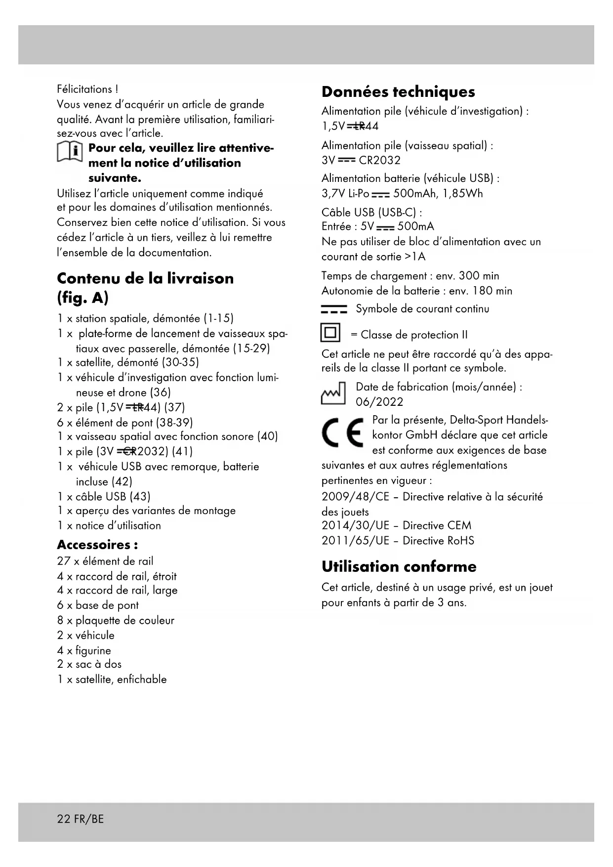 CR2032 Alimentation batterie (véhicule USB) : 3,7V Li-Po 500mAh, 1,85Wh Câble USB (USB-C) : Entrée : 5V 500mA Ne pas utiliser de bloc d’alimentation avec un courant de sortie >1A Temps de chargement : env. 300 min Autonomie de la batterie : env. 180 min Symbole de courant continu = Classe de protection II Cet article ne peut être raccordé qu’à des appa- reils de la classe II portant ce symbole. Date de fabrication (mois/année) : 06/2022 Par la présente, Delta-Sport Handels- kontor GmbH déclare que cet article est conforme aux exigences de base suivantes et aux autres réglementations pertinentes en vigueur : 2009/48/CE – Directive relative à la sécurité des jouets 2014/30/UE – Directive CEM 2011/65/UE – Directive RoHS Utilisation conforme Cet article, destiné à un usage privé, est un jouet pour enfants à partir de 3 ans.23 Consignes de sécurité