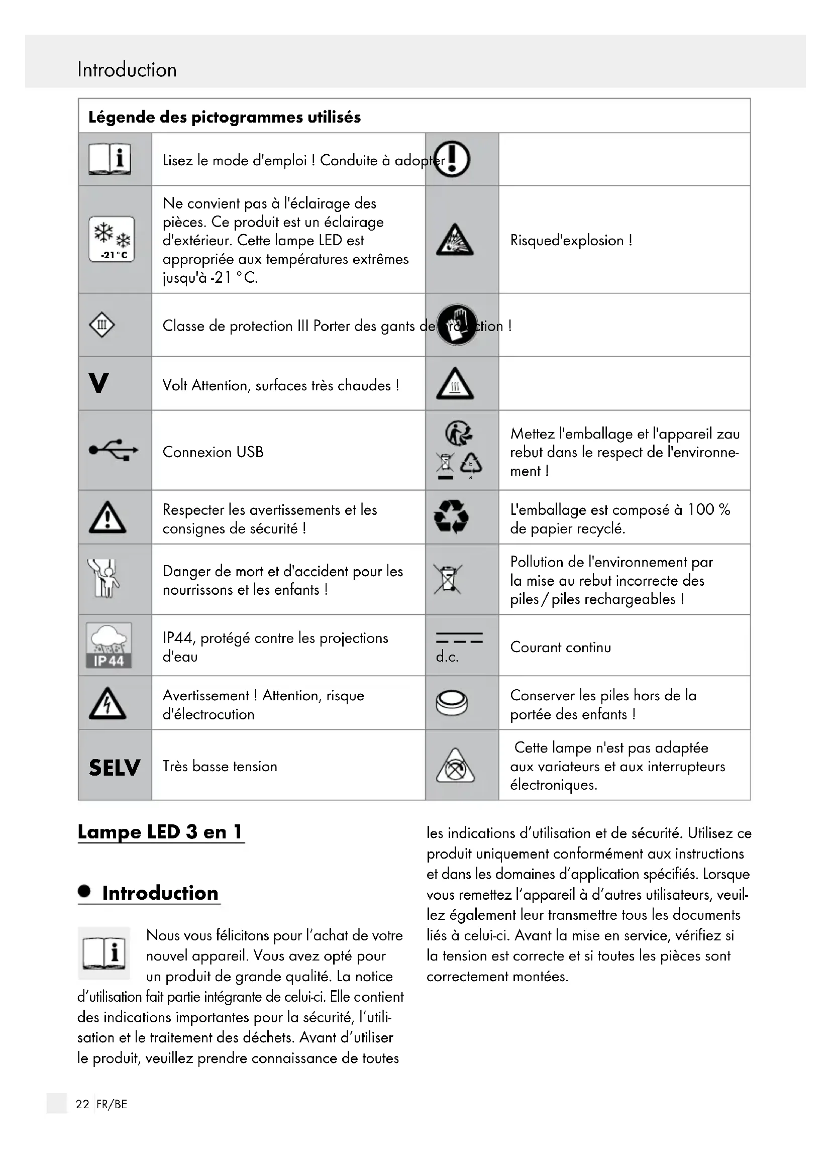 Cette lampe est donc pour un usage en intérieur et en extérieur. Cette lampe peut être fixe sur toutes les surfaces normalement inflammables. Cet appareil est uniquement destiné à un usage domestique et privilégié.