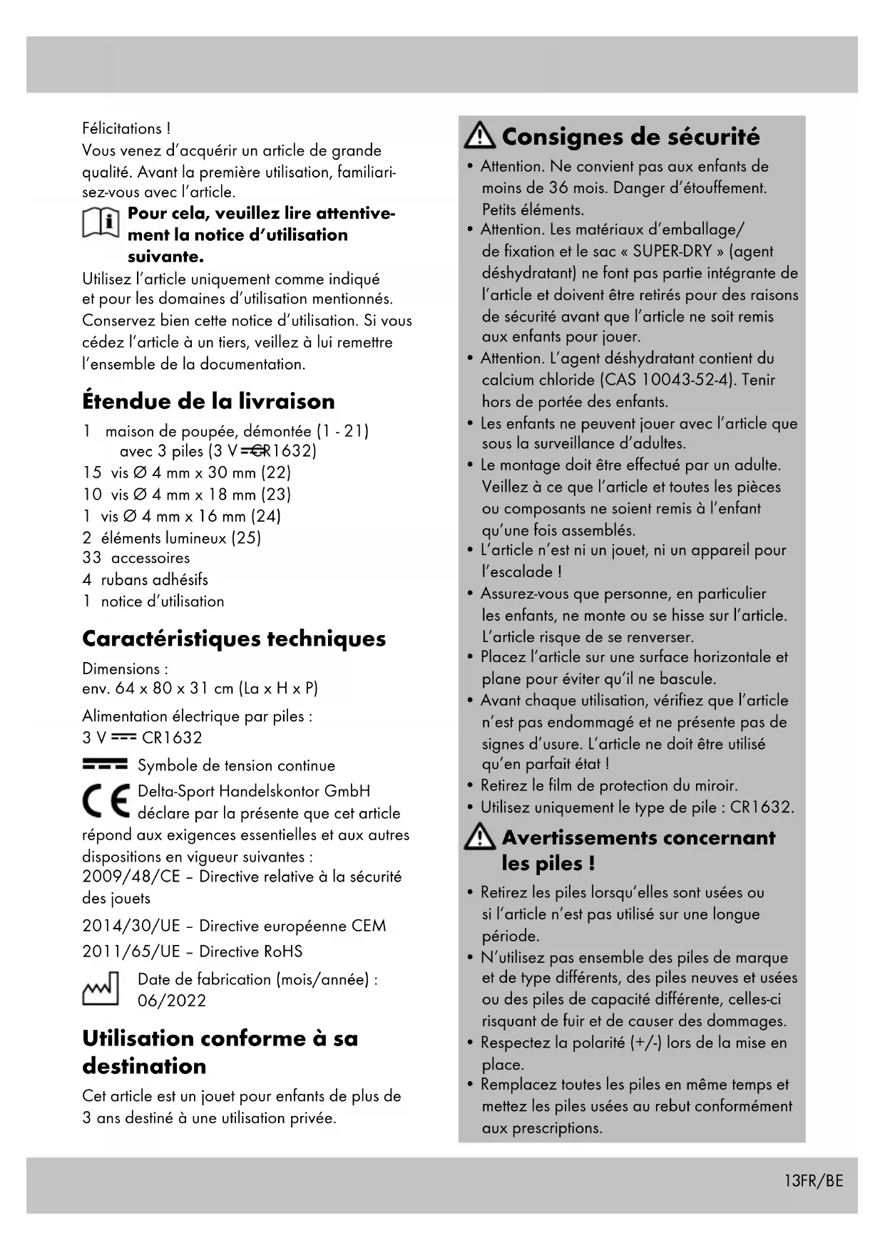 - s‘il présente les qualités qu‘un acheteur peut légitimement attendre eu égard aux déclara- tions publiques faites par le vendeur, par le producteur ou par son représentant, notam- ment dans la publicité ou l‘étiquetage ; 2° Ou s‘il présente les caractéristiques définies d‘un commun accord par les parties ou être propre à tout usage spécial recherché par l‘acheteur, porté à la connaissance du vendeur et que ce dernier a accepté. Article L217-12 du Code de la consommation L‘action résultant du défaut de conformité se prescrit par deux ans à compter de la délivrance du bien. Article 1641 du Code civil Le vendeur est tenu de la garantie à raison des défauts cachés de la chose vendue qui la rendent impropre à l‘usage auquel on la destine, ou qui diminuent tellement cet usage que l‘acheteur ne l‘aurait pas acquise, ou n‘en aurait donné qu‘un moindre prix, s‘il les avait connus. Article 1648 1er alinéa du Code civil L‘action résultant des vices rédhibitoires doit être intentée par l‘acquéreur dans un délai de deux ans à compter de la découverte du vice. Les pièces détachées indispensables à l’utili- sation du produit sont disponibles pendant la durée de la garantie du produit. IAN : 393053_2201 Service France Tel. : 0800 919270 E-Mail : deltasport@lidl.fr Service Belgique Tel. : 0800 12089 E-Mail : deltasport@lidl.be FR/BE17 Gefeliciteerd! Met uw aankoop hebt u voor een hoogwaardig artikel gekozen. Zorg ervoor dat u voor het eerste gebruik met het artikel vertrouwd raakt. Lees hiervoor de volgende gebruiksaanwijzing zorgvuldig door. Gebruik het artikel alleen zoals omschreven en voor het aangegeven doel. Bewaar deze ge- bruiksaanwijzing goed. Geef alle documenten mee als u het artikel aan iemand anders geeft. Leveringsomvang 1 x poppenhuis, gedemonteerd (1 - 21) incl. 3 x batterij (3 V CR1632) 15 x schroef Ø 4 mm x 30 mm (22) 10 x schroef Ø 4 mm x 18 mm (23) 1 x schroef Ø 4 mm x 16 mm (24) 2 x lamp (25) 33 x accessoire 4 x plakstrip 1 x gebruiksaanwijzing Technische gegevens Afmetingen: ca. 64 x 80 x 31 cm (b x h x d) Stroomvoorziening batterij: 3 V CR1632 Symbool voor gelijkspanning Hierbij verklaart Delta-Sport Handelskon- tor GmbH dat dit artikel voldoet aan de volgende basiseisen en de overige ter zake doende bepalingen: 2009/48/EG – Speelgoedrichtlijn 2014/30/EU – EMC-richtlijn 2011/65/EU – RoHS-richtlijn Productiedatum (maand/jaar): 06/2022 Beoogd gebruik Dit artikel is speelgoed voor kinderen vanaf 3 jaar oud voor particulier gebruik. Veiligheidstips