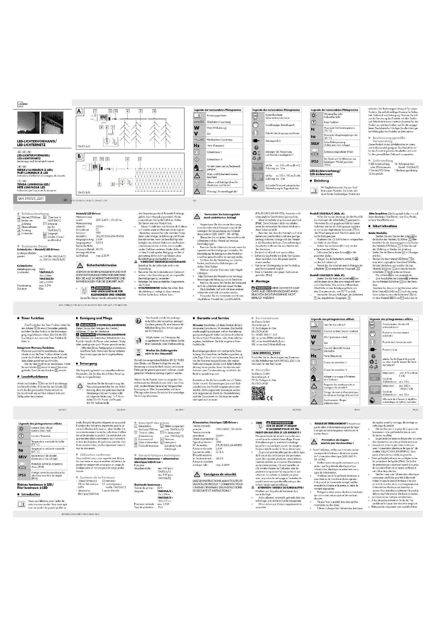 Interrupteur (minuterie/mode d‘éclairage Caractéristiques techniques Guirlande lumineuse + alimentation électrique/ LED-Driver : Puissance absorbée totale : env. 5 W (pour 10653LA/C) env. 5 W (pour 10653LB/D) Guirlande lumineuse : Tension de service : 30 V∼ Ampoule : 10653LA/C : 96 x 3 V 10653LB/D : 160 x 3 V Puissance nominale : max. 3,5 W Type de protection: IP44 mode d‘emploi fait partie intégrante de ce produit. Il contient des indications importantes pour la sé- curité, l’utilisation et la mise au rebut. Veuillez lire consciencieusement toutes les indications d‘utilisa- tion et de sécurité du produit. Ce produit doit uni- quement être utilisé conformément aux instructions et dans les domaines d‘application spécifiés. Lors d‘une cession à tiers, veuillez également remettre tous les documents. Utilisation conforme Ce produit est conçu pour apporter une décora- tion lumineuse en espace extérieur et intérieur. Le produit est uniquement conçu pour un usage do- mestique privé et non pas pour un usage profes- sionnel. Contenu de la livraison 1 rideau lumineux à LED ou filet lumineux à LED 1 alimentation électrique/LED-Driver 12 ventouses 12 vis (uniquement modèle 10653LA/C) 1 mode d‘emploi Légende des pictogrammes utilisés Lumière blanc chaud Lumière blanc froid