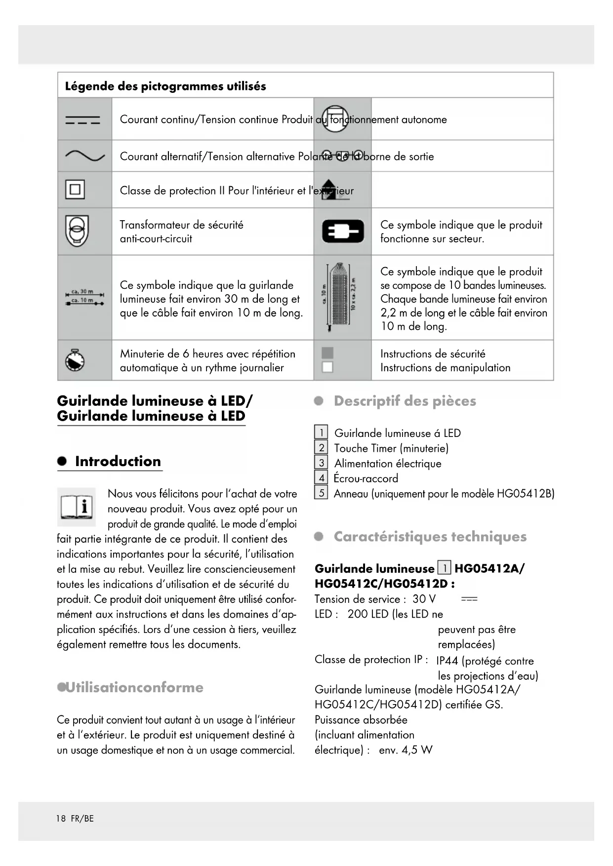 HG05412A/ HG05412C/HG05412D : Tension de service : 30 V LED : 200 LED (les LED ne peuvent pas être remplacées) Classe de protection IP: IP44 (protégé contre les projections d‘eau) Guirlande lumineuse (modèle HG05412A/ HG05412C/HG05412D) certifiée GS. Puissance absorbée (incluant alimentation électrique) : env. 4,5 W19 FR/BE HG05412B : Tension de fonctionnement : 30 V LED : 180 LED (les LED ne peuvent pas être remplacées) Classe de protection IP: IP44 (protégé contre les projections d‘eau) Guirlande lumineuse (modèle n° : HG05412B) Certifié GS. Consommation totale de courant (bloc d‘alimentation fourni) : env. 4,5 W Bloc d‘alimentation