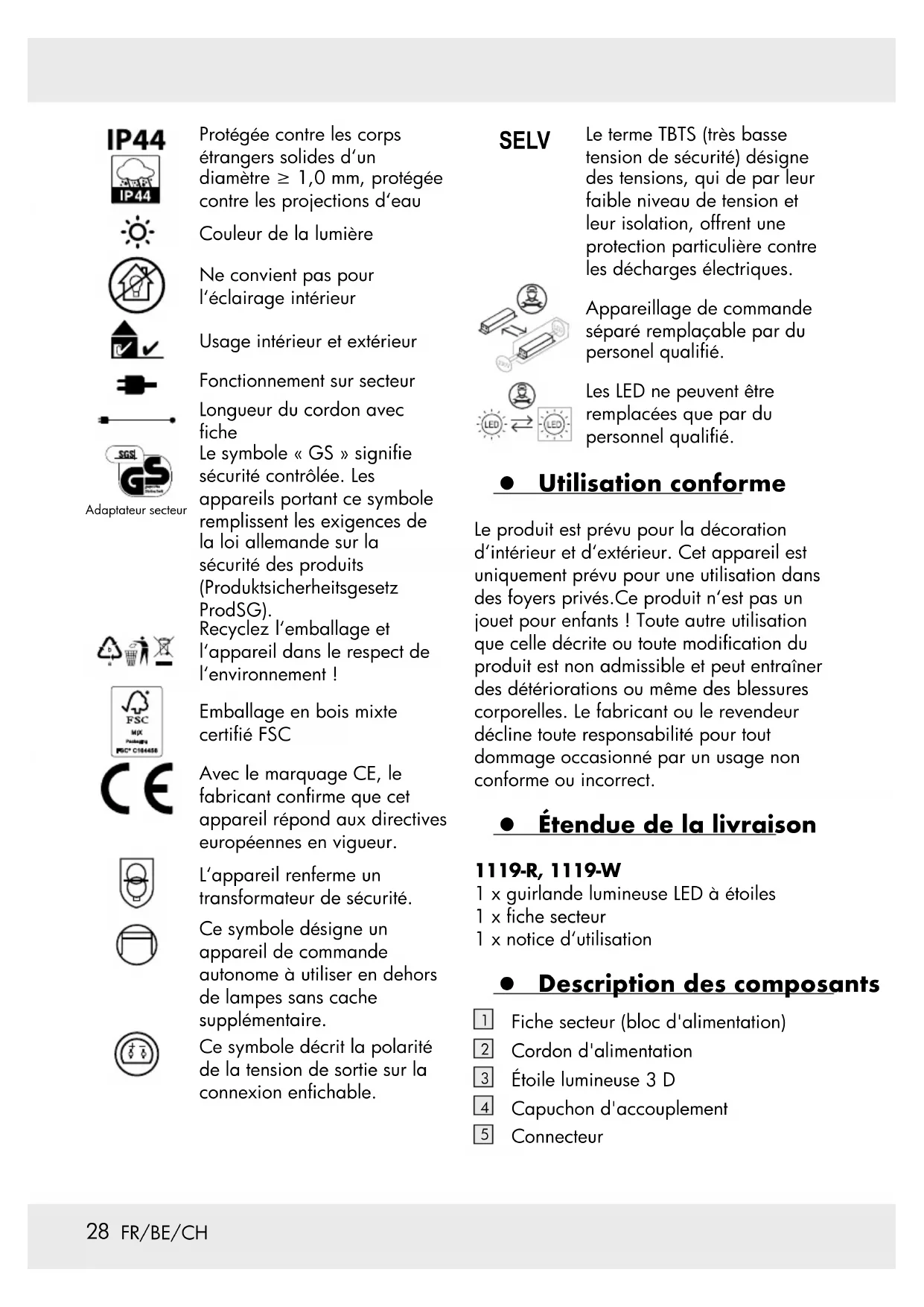 AVERTISSEMENT ! Observez la notice d‘utilisation intégrale et les consignes de sécurité an d‘éviter toute blessure corporelle et tout dommage matériel. Le guide rapide fait partie intégrale de ce produit. Avant d‘utiliser le produit, familiarisez-vous avec toutes les consignes d‘utilisation et de sécurité. Conservez bien le guide rapide et remettez également tous les documents en cas de cession de l‘article à un tiers. z Explication des symboles Lire la notice d‘utilisation ! Date d’édition de la notice d’utilisation (mois/année) Date de fabrication (mois/année) Tensión de corriente alterna. Tension continue Danger de mort et d‘accident pour les jeunes enfants et les enfants ! Respecter les avertissements et les consignes de sécurité ! AVERTISSEMENT ! Risque d‘électrocution ! Les appareils électriques portant ce symbole appartiennent à la classe de protection II.28 FR/BE/CH Protégée contre les corps étrangers solides d‘un diamètre ≥ 1,0 mm, protégée contre les projections d‘eau Couleur de la lumière Ne convient pas pour l‘éclairage intérieur Usage intérieur et extérieur Fonctionnement sur secteur Longueur du cordon avec che Adaptateur secteur Le symbole « GS » signie sécurité contrôlée. Les appareils portant ce symbole remplissent les exigences de la loi allemande sur la sécurité des produits (Produktsicherheitsgesetz ProdSG). Recyclez l‘emballage et l‘appareil dans le respect de l‘environnement ! Emballage en bois mixte certié FSC Avec le marquage CE, le fabricant conrme que cet appareil répond aux directives européennes en vigueur. L‘appareil renferme un transformateur de sécurité. Ce symbole désigne un appareil de commande autonome à utiliser en dehors de lampes sans cache supplémentaire. Ce symbole décrit la polarité de la tension de sortie sur la connexion enchable. SELV Le terme TBTS (très basse tension de sécurité) désigne des tensions, qui de par leur faible niveau de tension et leur isolation, offrent une protection particulière contre les décharges électriques. Appareillage de commande séparé remplaçable par du personel qualié. Les LED ne peuvent être remplacées que par du personnel qualié. z Utilisation conforme Le produit est prévu pour la décoration d‘intérieur et d‘extérieur. Cet appareil est uniquement prévu pour une utilisation dans des foyers privés.Ce produit n‘est pas un jouet pour enfants ! Toute autre utilisation que celle décrite ou toute modication du produit est non admissible et peut entraîner des détériorations ou même des blessures corporelles. Le fabricant ou le revendeur décline toute responsabilité pour tout dommage occasionné par un usage non conforme ou incorrect. z Étendue de la livraison 1119-R, 1119-W 1 x guirlande lumineuse LED à étoiles 1 x che secteur 1 x notice d‘utilisation z Description des composants
