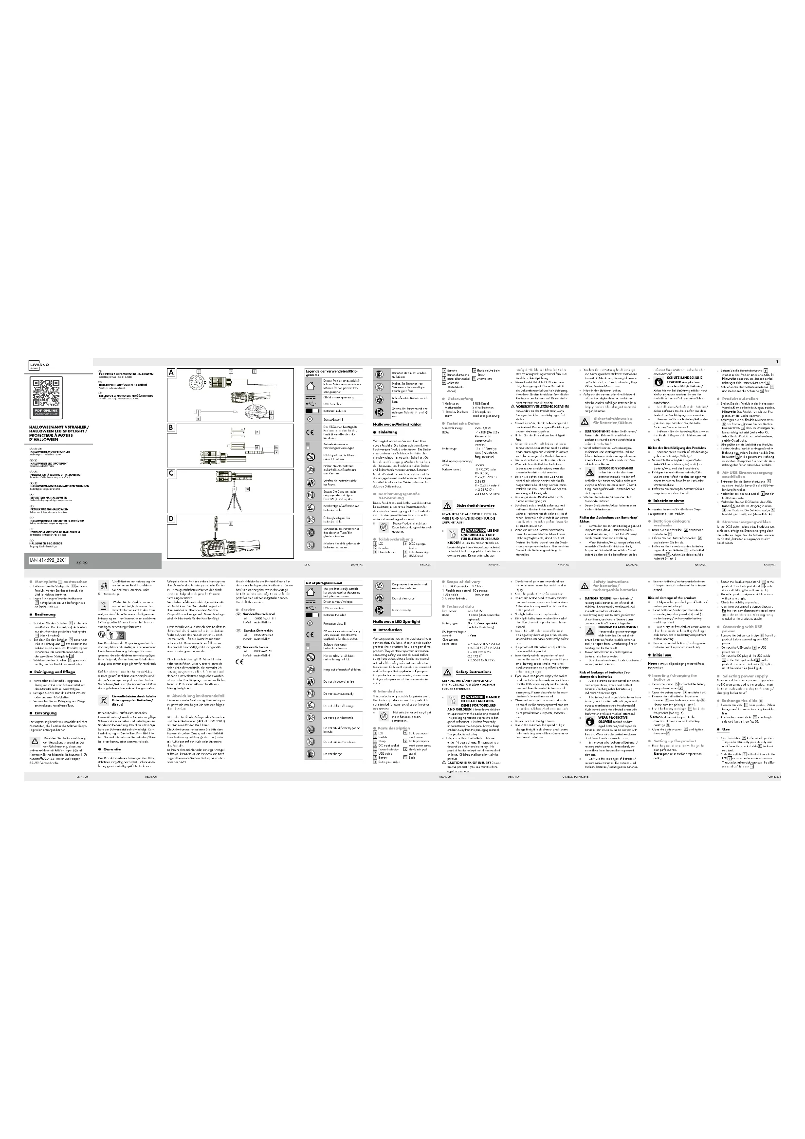 ENFANTS EN BAS ÂGE ET LES EN- FANTS! Ne laissez jamais des enfants manipuler sans surveillance les matériaux d’emballage. Il existe un risque d’étouffe- ment avec les matériaux d’emballage. Les enfants sous-estiment souvent les dangers. Tenez toujours les enfants éloignés des Légende des pictogrammes utilisés Ce produit est exclusivement conçu pour une utilisation décorative dans des endroits secs et dans le cadre d'un usage privé. Courant continu / Tension continue Port USB Piles fournies Classe de protection III Le sigle CE confirme la conformité avec les directives UE applicables au produit. Consignes de sécurité Instructions de manipulation Ne convient pas pour les enfants de moins de 14 ans! Gardez les piles hors de portée des enfants. Ne jetez pas de piles au feu. Respectez la polarité lors de l'insertion des piles (+ et –). Ne détériorez pas/ne déformez pas les piles. N'ouvrez pas/ne démontez pas les piles. Utilisez uniquement des piles de type/de marque iden- tique. Ne mélangez pas des piles usagées avec des piles neuves. Les piles ne sont pas rechar- geables. Tenez les piles éloignées de l'eau et d'une humidité excessive. Ne mettez pas les piles en court-circuit. Respectez la polarité lors de l'insertion des piles (+ et –). Projecteur à motifs d’Halloween Introduction Nous vous félicitons pour l‘achat de votre nouveau produit. Vous avez opté pour un produit de grande qualité. Le mode d‘emploi fait partie intégrante de ce produit. Il contient des indications importantes pour la sécurité, l’utilisation et la mise au rebut. Veuillez lire consciencieusement toutes les indications d‘uti- lisation et de sécurité du produit. Ce produit doit uniquement être utilisé conformément aux instructions et dans les domaines d‘application spécifiés. Lors d‘une cession à tiers, veuillez également remettre tous les documents. Utilisation conforme Ce produit est exclusivement conçu pour l‘éclai- rage décoratif dans des locaux intérieurs secs et dans le cadre d‘un usage privé. Le produit n‘est pas destiné à une utilisation commerciale ou à d‘autres utilisations. Ce produit n‘est pas destiné à servir d‘éclairage de pièce dans un foyer domestique. Descriptif des pièces