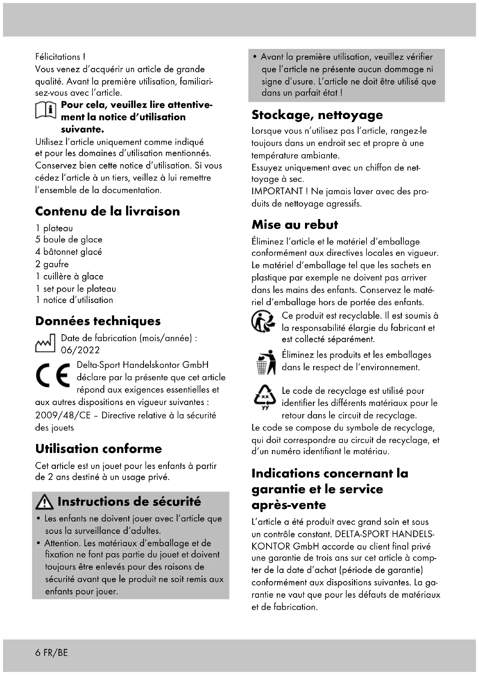 - s‘il présente les qualités qu‘un acheteur peut légitimement attendre eu égard aux déclara- tions publiques faites par le vendeur, par le producteur ou par son représentant, notam- ment dans la publicité ou l‘étiquetage ; 2° Ou s‘il présente les caractéristiques définies d‘un commun accord par les parties ou être propre à tout usage spécial recherché par l‘acheteur, porté à la connaissance du vendeur et que ce dernier a accepté. Article L217-12 du Code de la consommation L‘action résultant du défaut de conformité se prescrit par deux ans à compter de la délivrance du bien. Article 1641 du Code civil Le vendeur est tenu de la garantie à raison des défauts cachés de la chose vendue qui la rendent impropre à l‘usage auquel on la destine, ou qui diminuent tellement cet usage que l‘acheteur ne l‘aurait pas acquise, ou n‘en aurait donné qu‘un moindre prix, s‘il les avait connus. FR/BE8 FR/BE Article 1648 1er alinéa du Code civil L‘action résultant des vices rédhibitoires doit être intentée par l‘acquéreur dans un délai de deux ans à compter de la découverte du vice. Les pièces détachées indispensables à l’utili- sation du produit sont disponibles pendant la durée de la garantie du produit. IAN : 392861_2201 Service France Tel. : 0800 919270 E-Mail : deltasport@lidl.fr Service Belgique Tel. : 0800 12089 E-Mail : deltasport@lidl.be9 Gefeliciteerd! Met uw aankoop hebt u voor een hoogwaardig artikel gekozen. Zorg ervoor dat u voor het eerste gebruik met het artikel vertrouwd raakt. Lees hiervoor de volgende gebruiksaanwijzing zorgvuldig door. Gebruik het artikel alleen zoals omschreven en voor het aangegeven doel. Bewaar deze ge- bruiksaanwijzing goed. Geef alle documenten mee als u het artikel aan iemand anders geeft. Leveringsomvang 1 x dienblad 5 x ijsbolletje 4 x ijs op een stokje 2 x wafel 1 x ijslepel 1 x tablet-oplegblad 1 x gebruiksaanwijzing Technische gegevens Productiedatum (maand/jaar): 06/2022 Hierbij verklaart Delta-Sport Handelskontor GmbH dat dit artikel voldoet aan de volgende basiseisen en de overige ter zake doende bepalingen: 2009/48/EG – Speelgoedrichtlijn Correct gebruik Dit artikel is speelgoed voor kinderen vanaf 2 jaar voor particulier gebruik. Veiligheidsinstructies