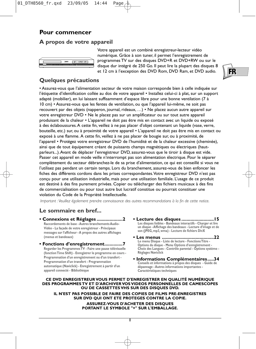 01_DTH8560_fr.qxd 23/09/05 14:44 Page 1 Pour commencer A propos de votre appareil Votre appareil est un combiné enregistreur-lecteur vidéo numérique. Grâce à son tuner, il permet l’enregistrement de programmes TV sur des disques DVD+R et DVD+RW ou sur le disque dur intégré de 250 Go. Il peut lire la plupart des disques 8 et 12 cm à l’exception des DVD Rom, DVD Ram, et DVD audio. Quelques précautions