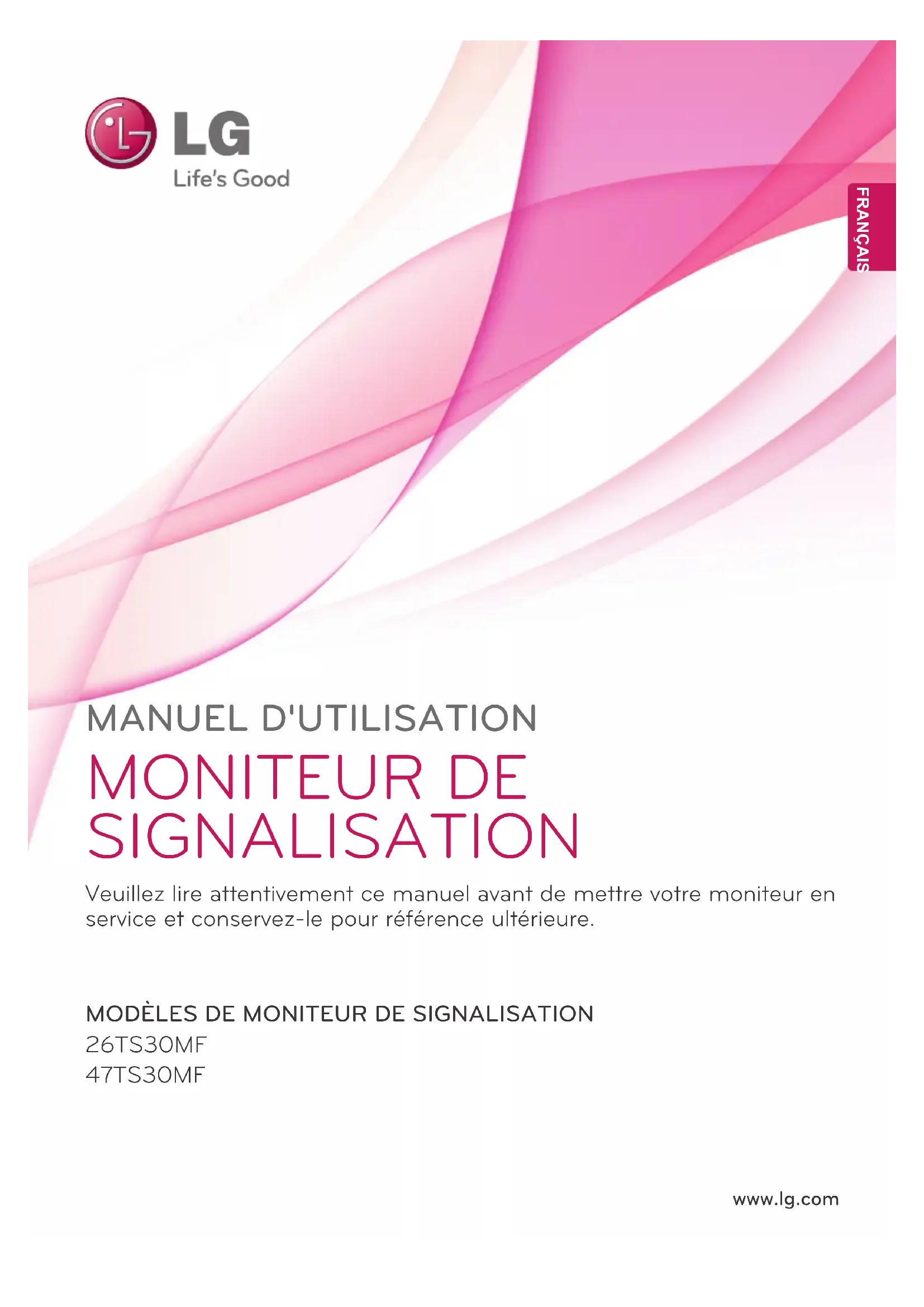 www.lg.com MANUEL D'UTILISATION MONITEUR DE SIGNALISATION 26TS30MF 47TS30MF Veuillez lire attentivement ce manuel avant de mettre votre moniteur en service et conservez-le pour référence ultérieure.