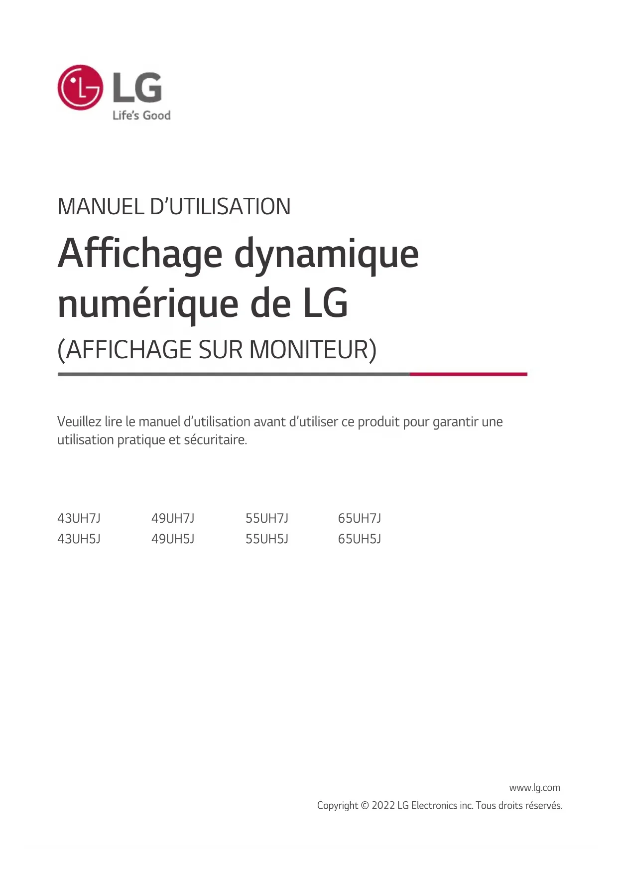 Affichage dynamique numérique de LG (AFFICHAGE SUR MONITEUR) 43UH7J 43UH5J 49UH7J 49UH5J 55UH7J 55UH5J 65UH7J 65UH5J www.lg.comCopyright © 2022 LG Electronics inc. Tous droits réservés. Veuillez lire le manuel d’utilisation avant d’utiliser ce produit pour garantir une utilisation pratique et sécuritaire.2 FRANÇAIS