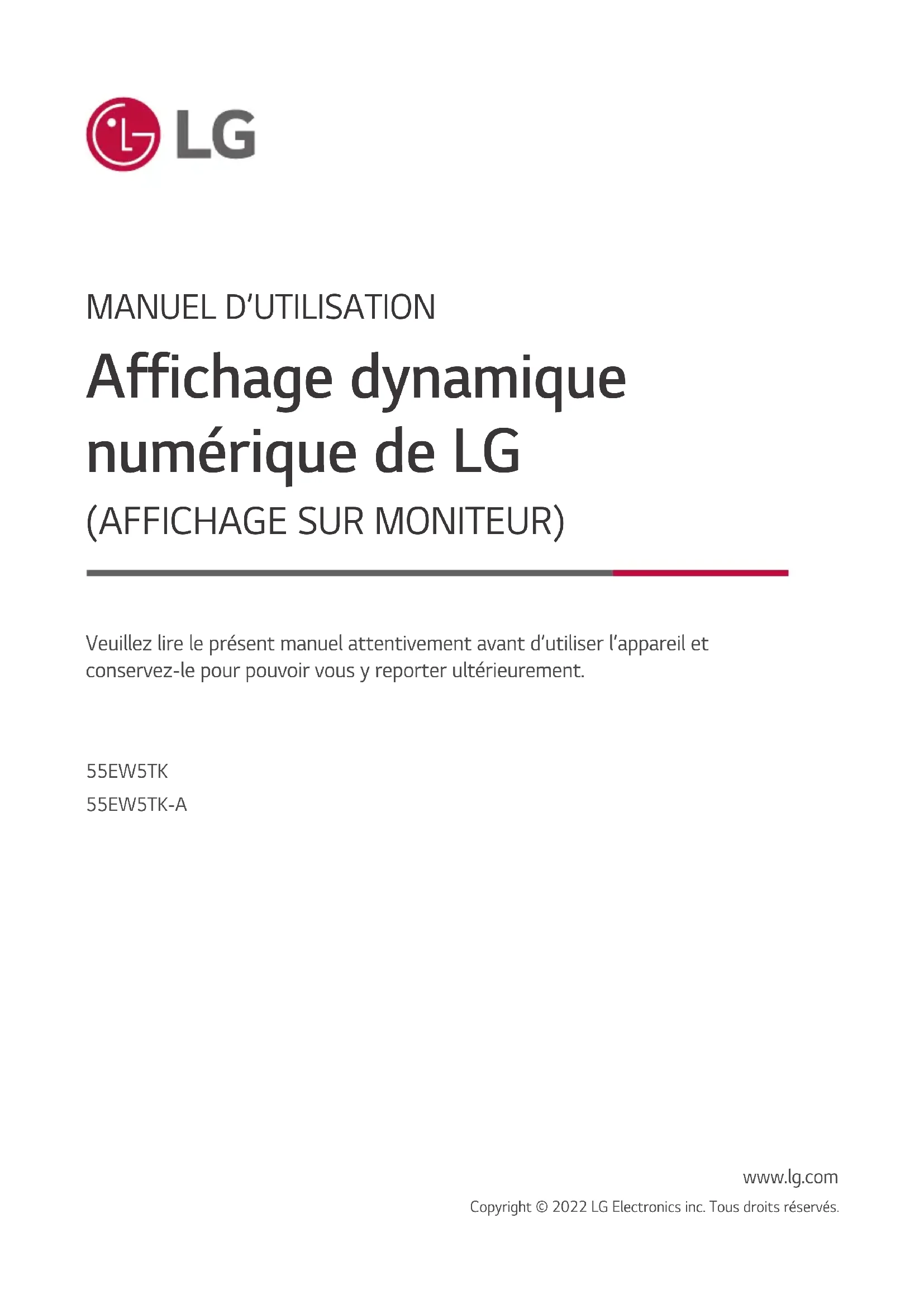 Affichage dynamique numérique de LG (AFFICHAGE SUR MONITEUR) 55EW5TK 55EW5TK-A www.lg.com Copyright © 2022 LG Electronics inc. Tous droits réservés. Veuillez lire le présent manuel attentivement avant d’utiliser l’appareil et conservez-le pour pouvoir vous y reporter ultérieurement.2 FRANÇAIS
