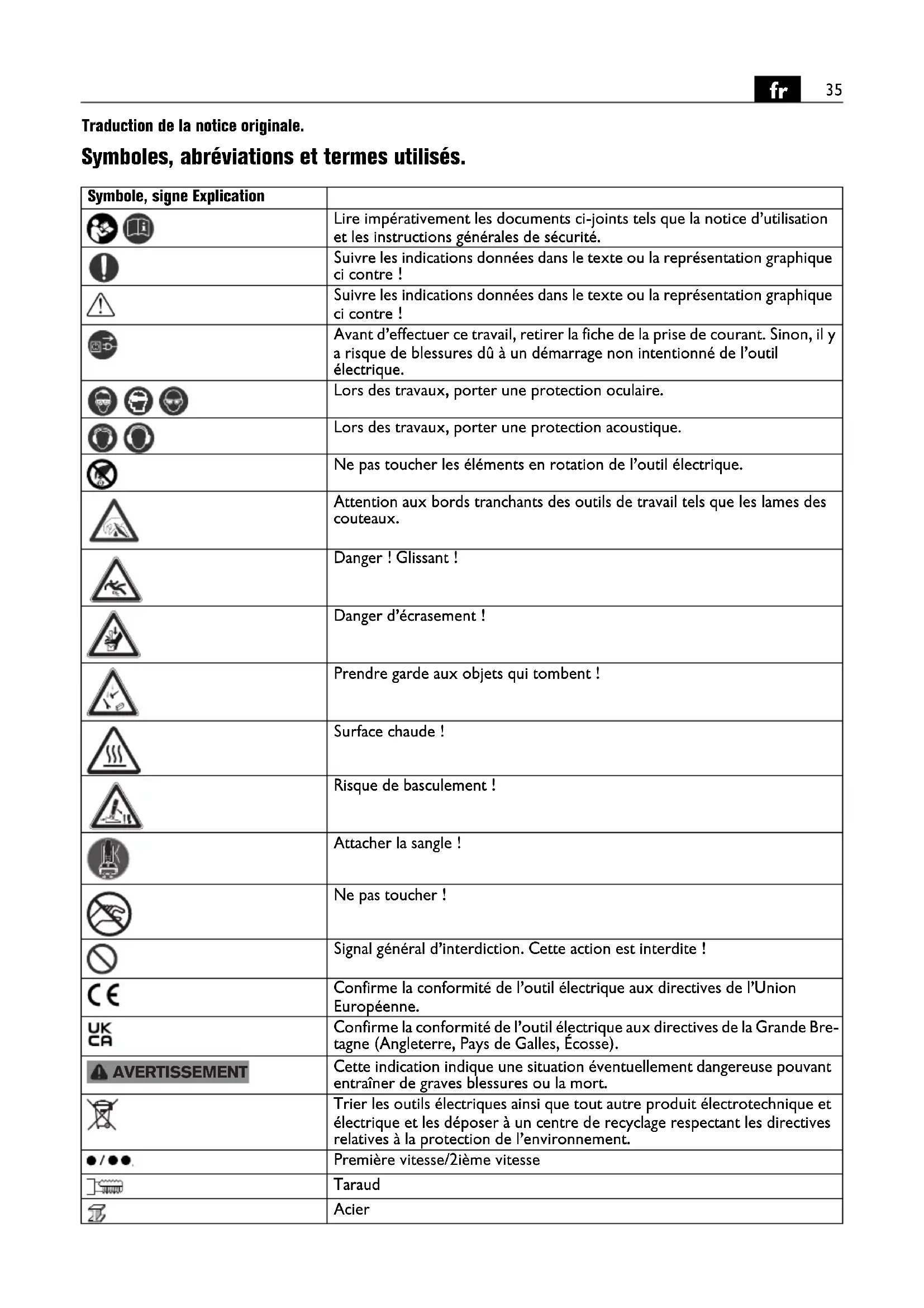 Traduction de la notice originale. Symboles, abréviations et termes utilisés. Symbole, signe Explication Lire impérativement les documents ci-joints tels que la notice d’utilisation et les instructions générales de sécurité. Suivre les indications données dans le texte ou la représentation graphique ci contre ! Suivre les indications données dans le texte ou la représentation graphique ci contre ! Avant d’effectuer ce travail, retirer la fiche de la prise de courant. Sinon, il y a risque de blessures dû à un démarrage non intentionné de l’outil électrique. Lors des travaux, porter une protection oculaire. Lors des travaux, porter une protection acoustique. Ne pas toucher les éléments en rotation de l’outil électrique. Attention aux bords tranchants des outils de travail tels que les lames des couteaux. Danger ! Glissant ! Danger d’écrasement ! Prendre garde aux objets qui tombent ! Surface chaude ! Risque de basculement ! Attacher la sangle ! Ne pas toucher ! Signal général d’interdiction. Cette action est interdite ! Confirme la conformité de l’outil électrique aux directives de l’Union Européenne. Confirme la conformité de l’outil électrique aux directives de la Grande Bre- tagne (Angleterre, Pays de Galles, Écosse). Cette indication indique une situation éventuellement dangereuse pouvant entraîner de graves blessures ou la mort. Trier les outils électriques ainsi que tout autre produit électrotechnique et électrique et les déposer à un centre de recyclage respectant les directives relatives à la protection de l’environnement. Première vitesse/2ième vitesse Taraud Acier AVERTISSEMENT36